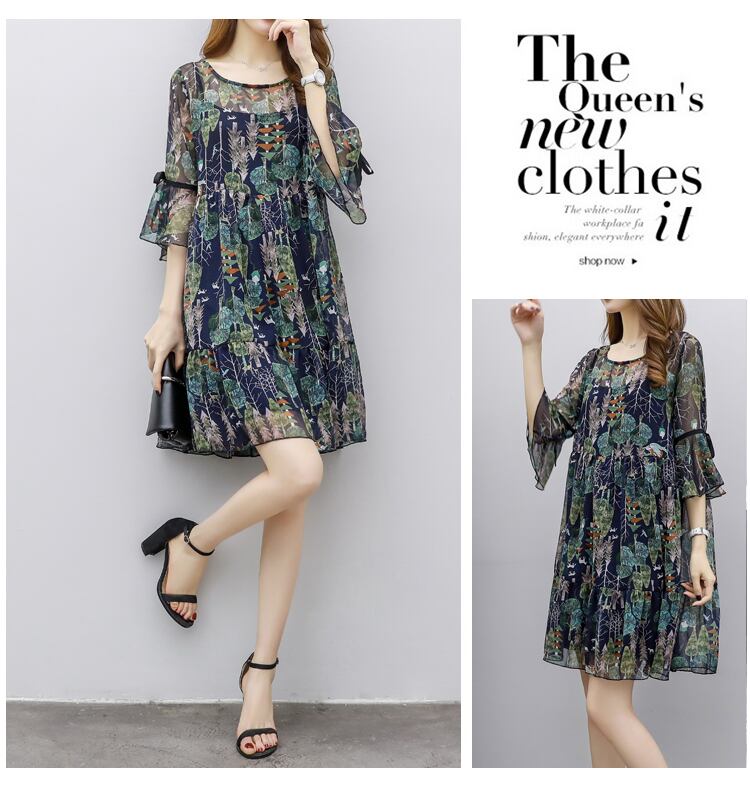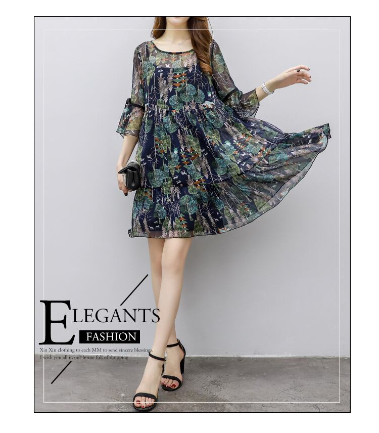 人気 韓国スタイル 8分袖 プリントシフォンワンピース ミニドレス