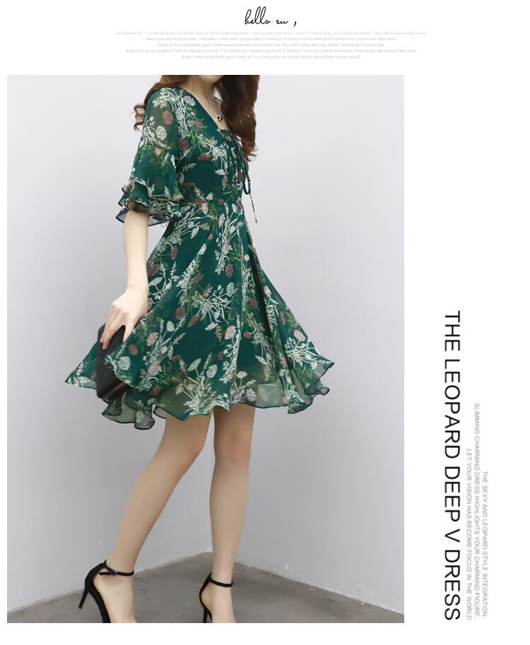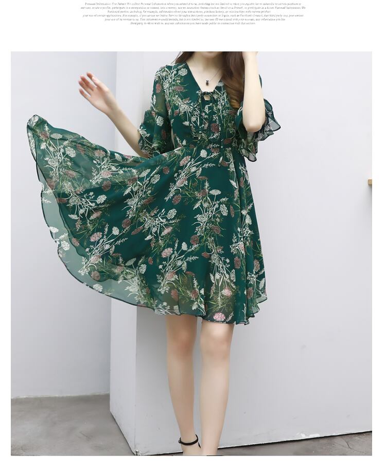 人気 韓国スタイル フラワープリント シフォン グリーンワンピース 5分袖