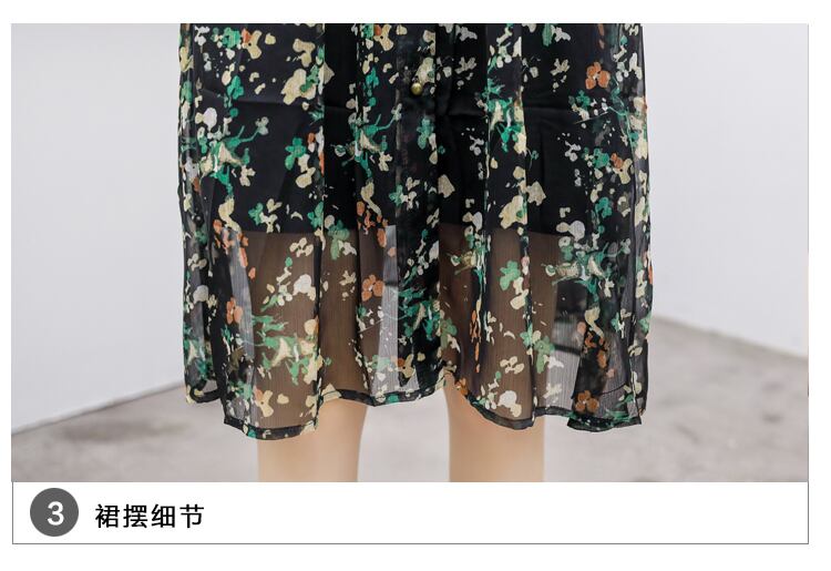 人気 韓国スタイル フラワープリント シフォン ブラック ワンピース 7分袖