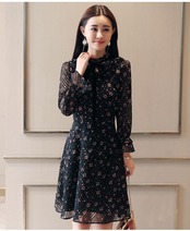 人気 韓国スタイル シフォンドレス ベルスリーブ プリントワンピース