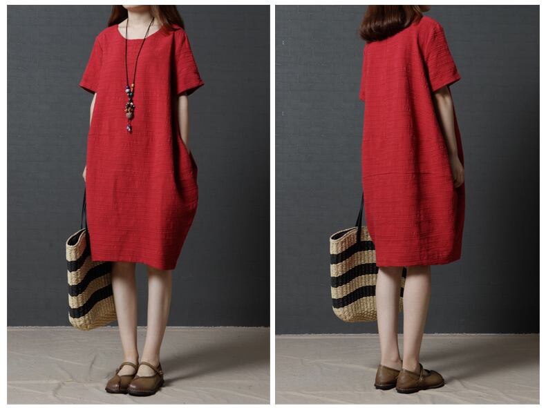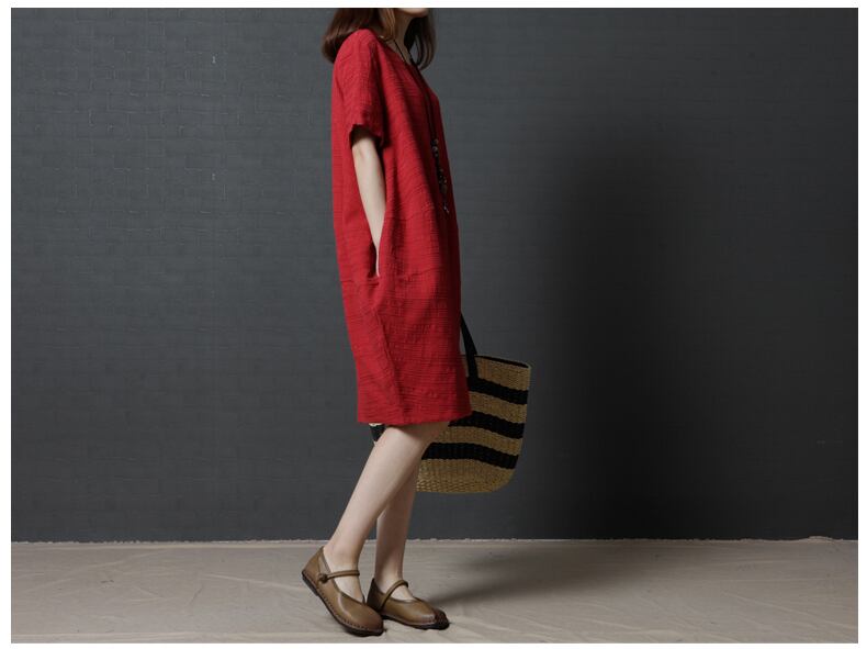 人気 韓国スタイル 半袖 コットン リネン ドレス ワンピース