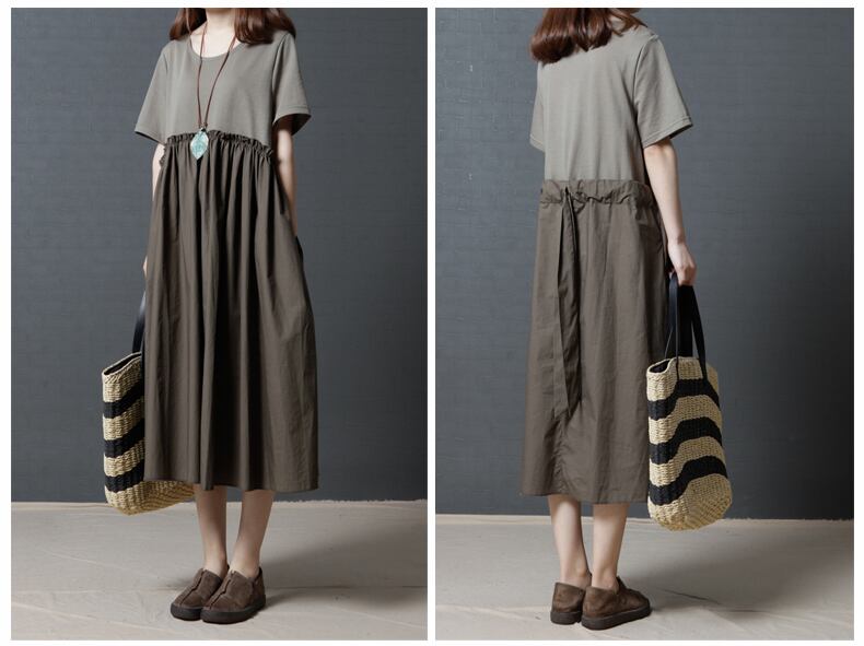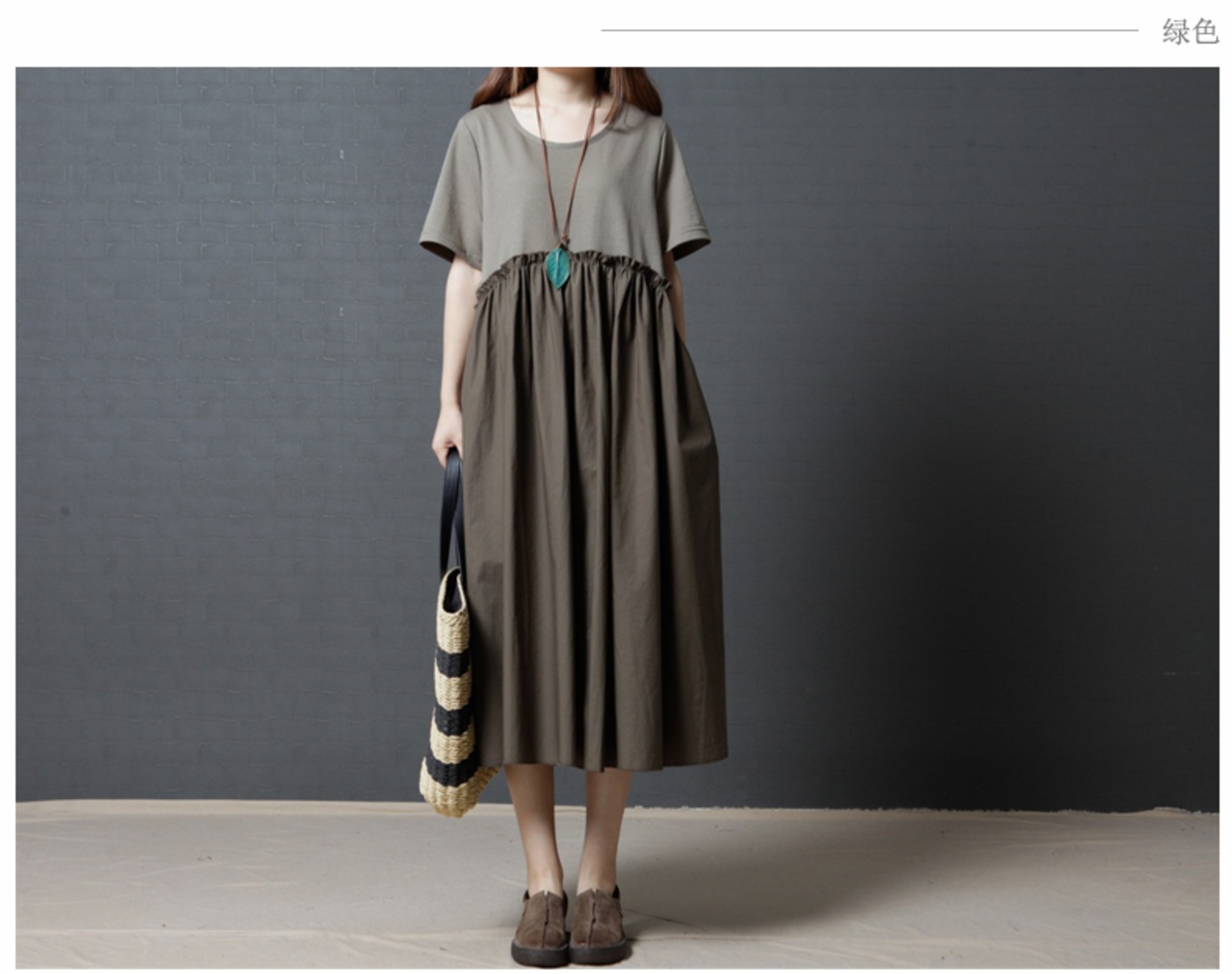 人気 韓国スタイル コットン リネン ラウンドネック ロングワンピース 半袖
