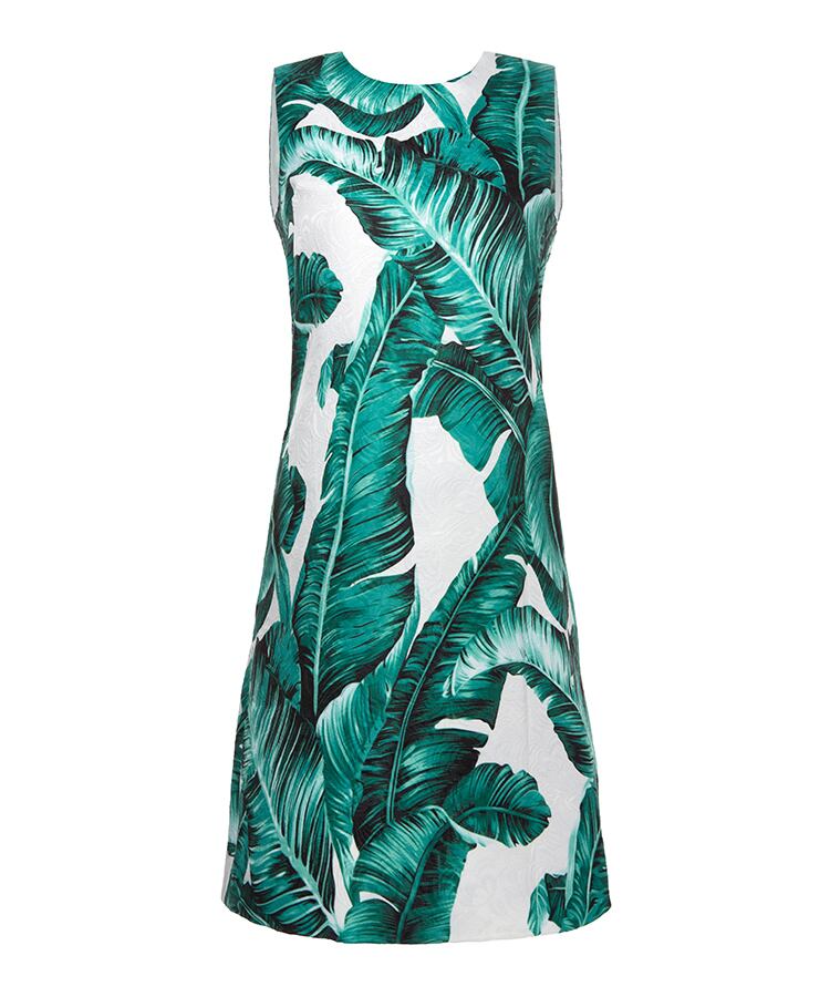 大きなバナナリーフを大胆にプリントした存在感のあるノースリーブワンピース。1枚で着ても存在感抜群、エンボス加工で高級感もあります♪