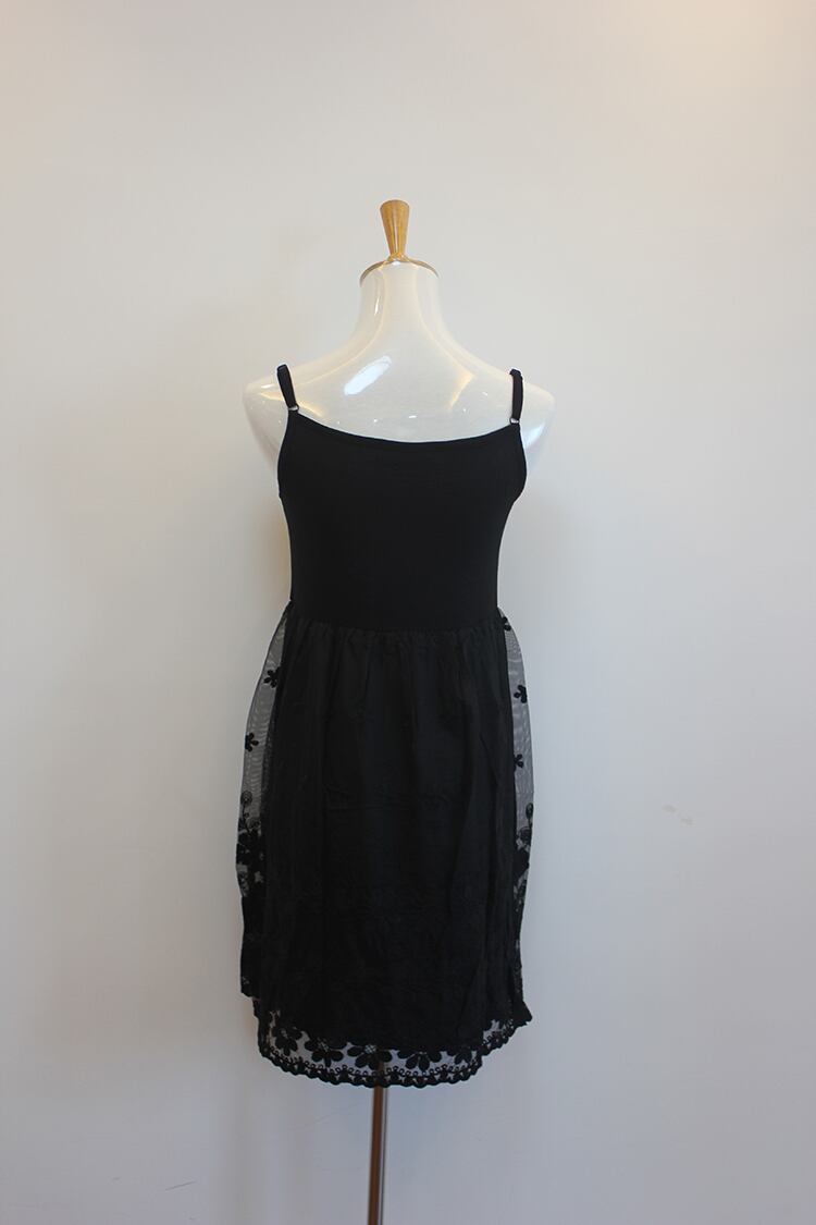 花柄の刺繍が華やか!メッシュのスカートがかわいいキャミソールワンピース。シャツでもカットソーでも合わせやすいお役立ちアイテム♪ ぽっちゃりさんにぴったりなクローバーサイズ。
