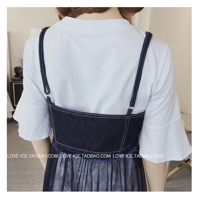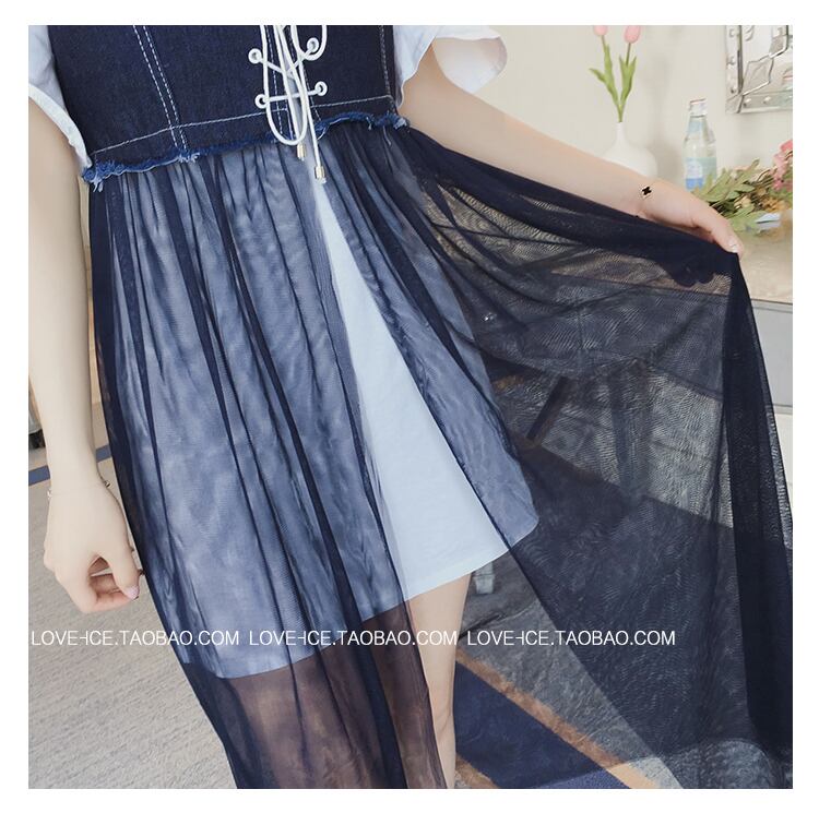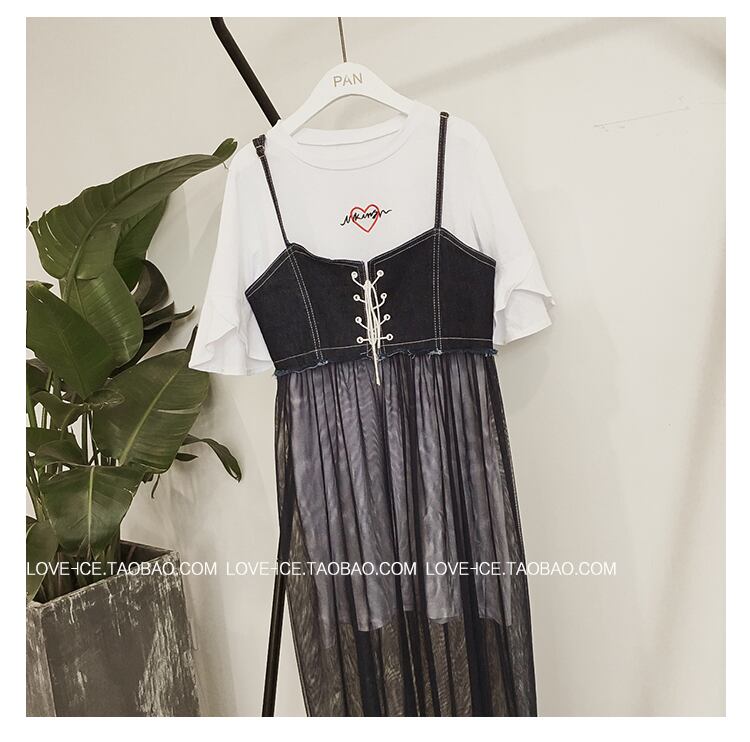 人気 韓国スタイル Tシャツ コンビ デニムステッチメッシュドレス