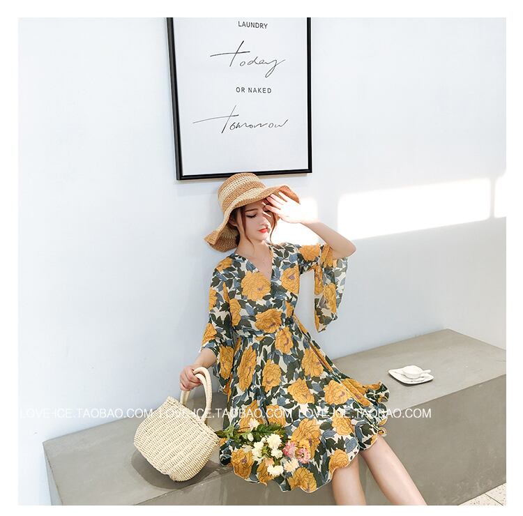 人気 韓国スタイル Vカラートランペットスリーブ ワンピース
