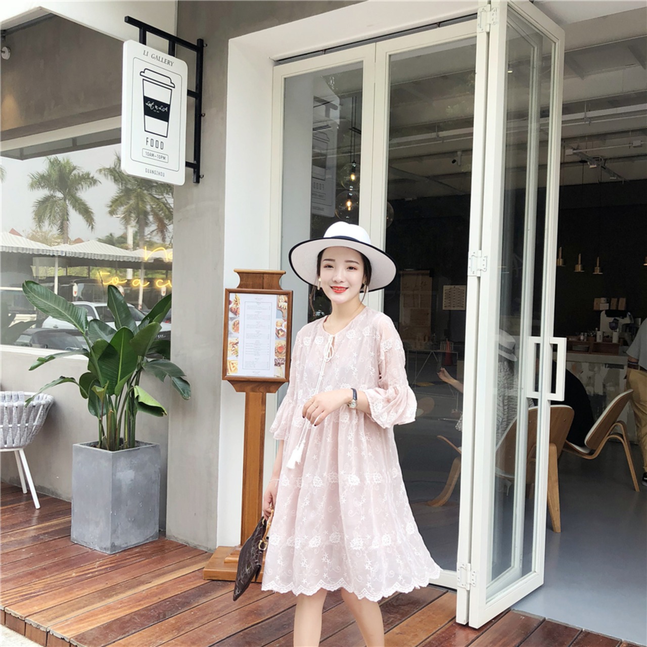人気 韓国スタイル シフォン刺繍ドレス Vネック Aライン 5分袖