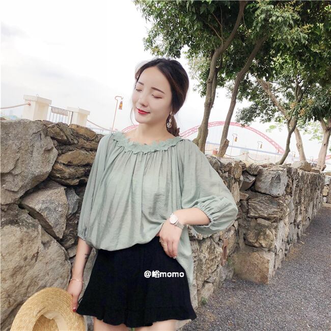 人気 韓国スタイル ランタンスリーブ レースステッチシフォンシャツ