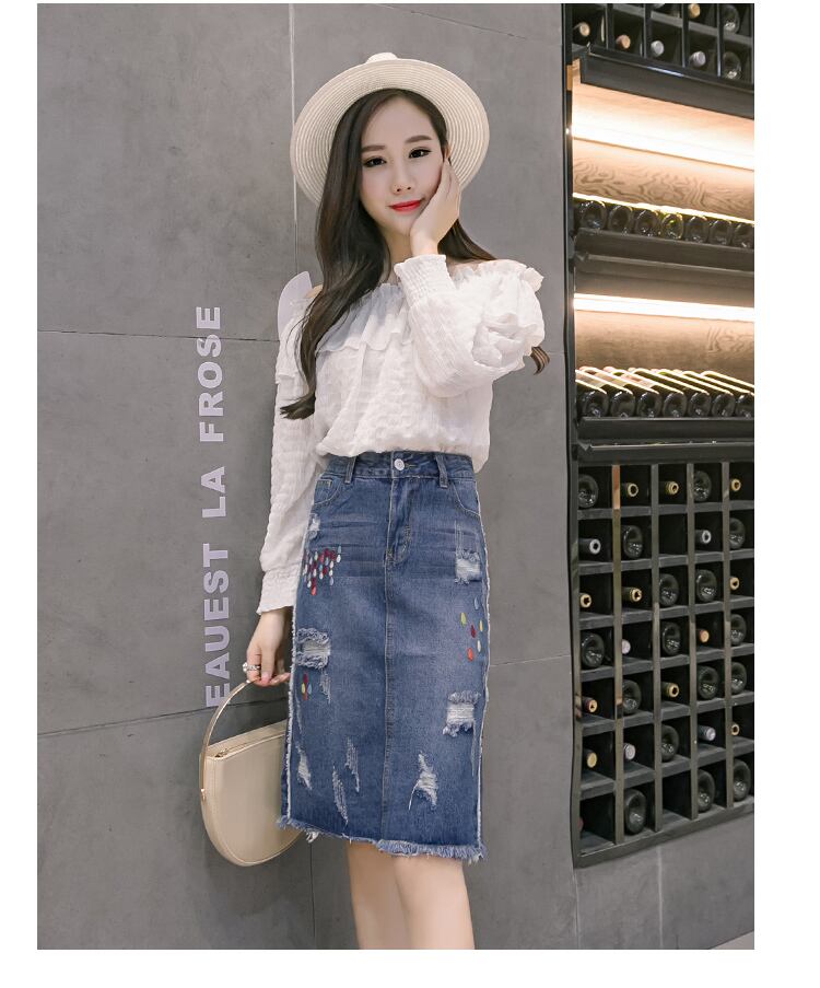 刺繍デニムスカート(レインドロップ)レトロ ダメージ ハイウエスト ロング ヒップハング