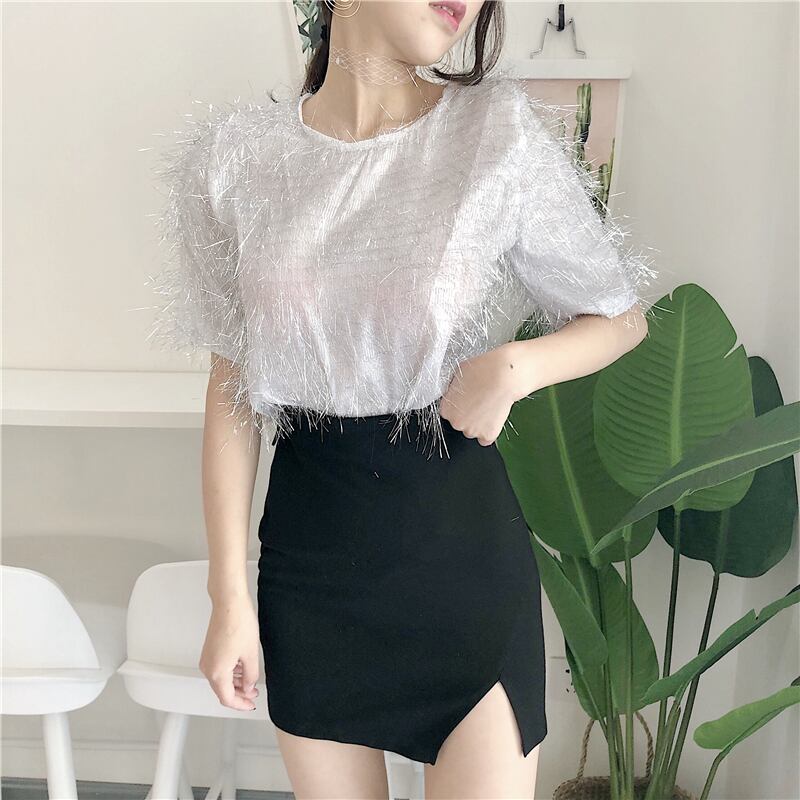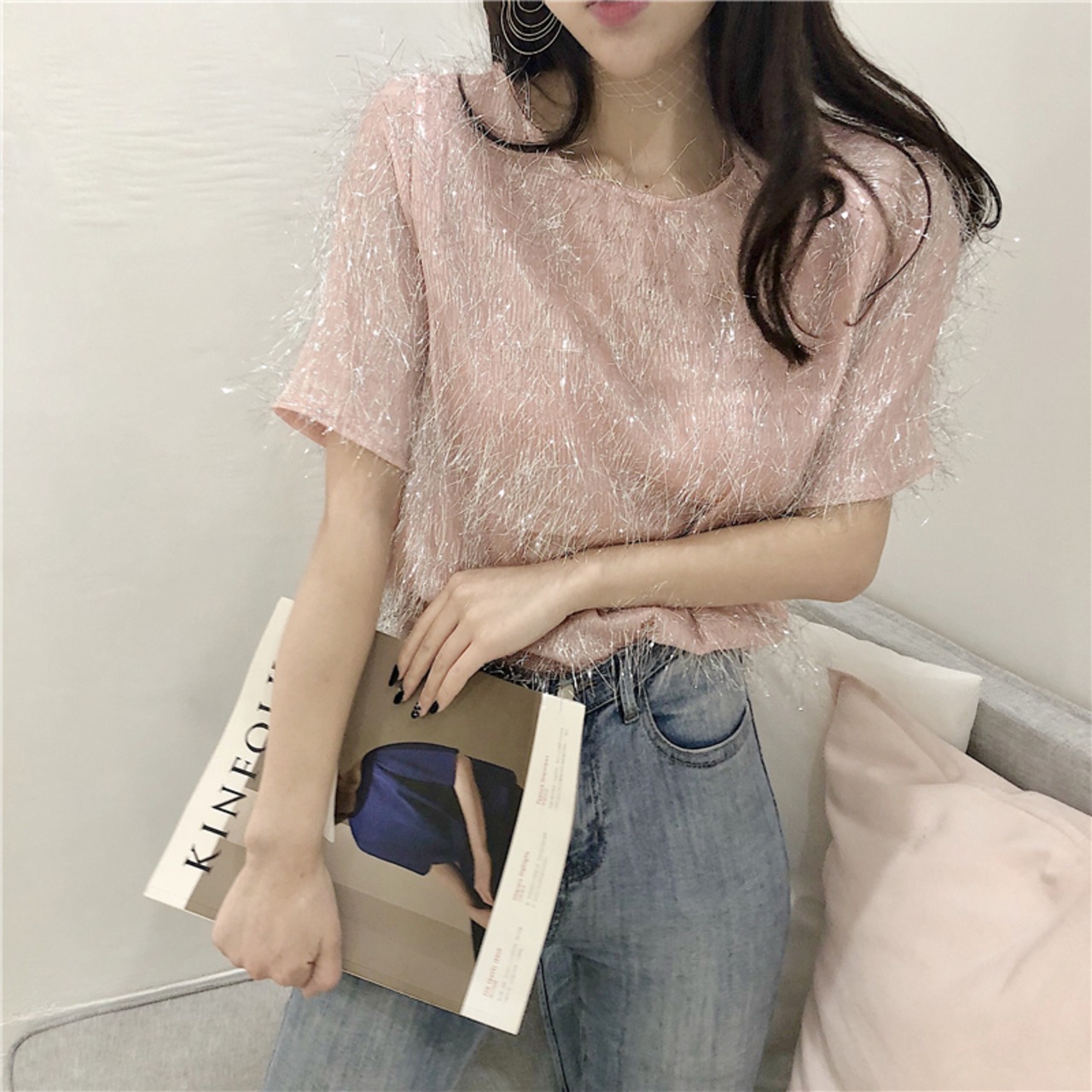 フリンジ半袖Tシャツ ルーズラウンドネック ライトシルクボトミングシャツ