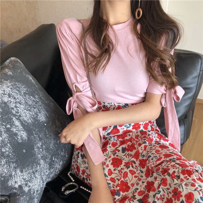 レトロ ラウンドネック 半袖 シンプルTシャツ リボン