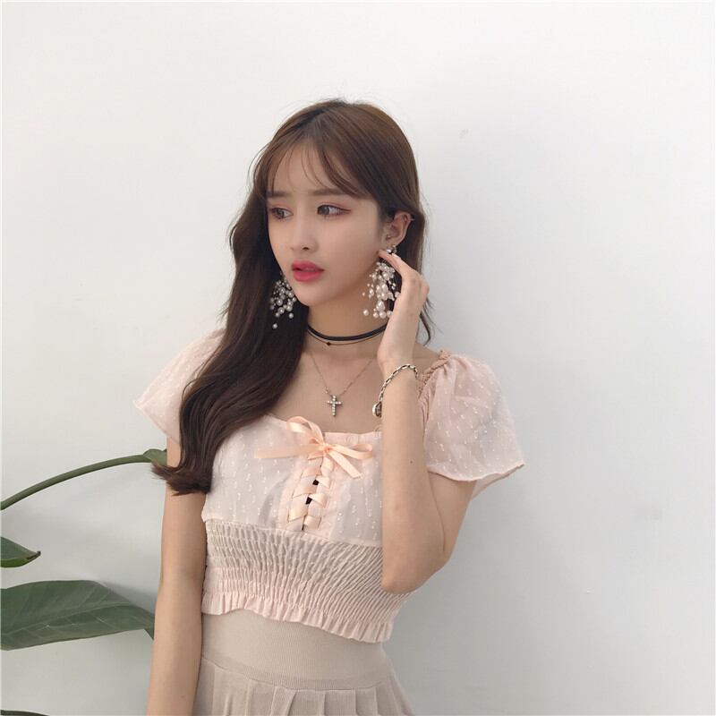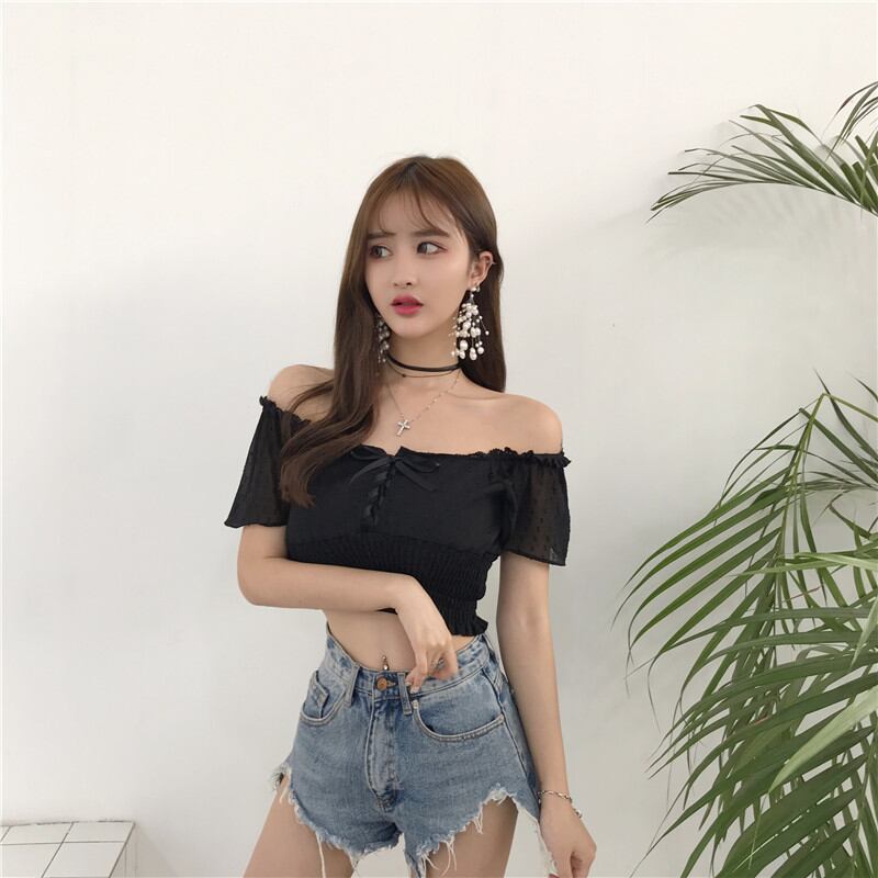 胸元のリボンとレースが可愛らしい♪肩が大きくショート丈のセクシーなブラウス。ジーンズに合わせて甘辛ミックスを楽しんでも、フリルスカートでスィートなスタイルにしても◎