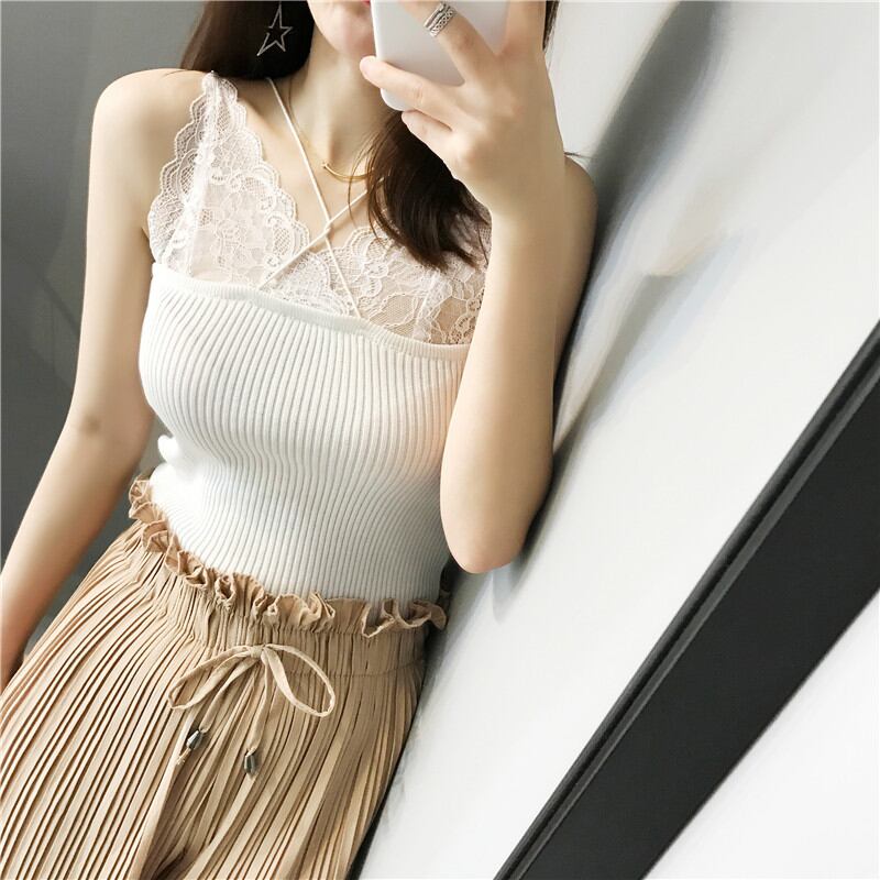 胸元のレースが美しいタイトなキャミソール。ストリングスが交差しているのも個性的♪ブラウスからフリルを見せたりジャケットのインに着ても◎