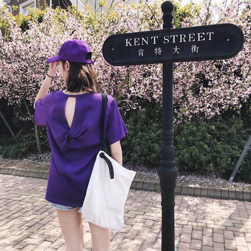 背中に大きく開いた穴がセクシー♪前からみるとシンプルスタイル、背中を向けると個性的な印象に。ロング丈にショートパンツを合わせても、細いパンツとも相性◎