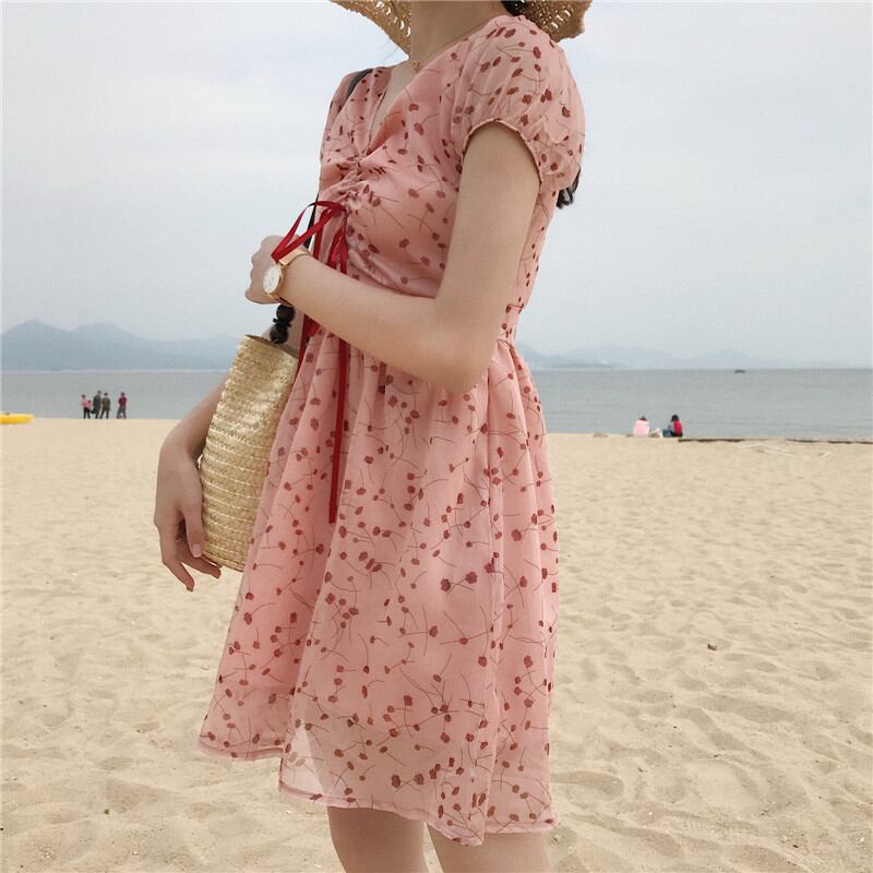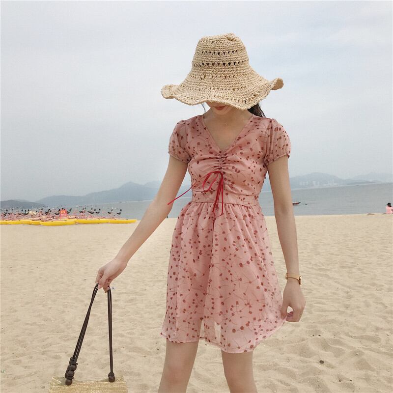 人気 韓国スタイル サマードレス チェリーピンク ワンピース
