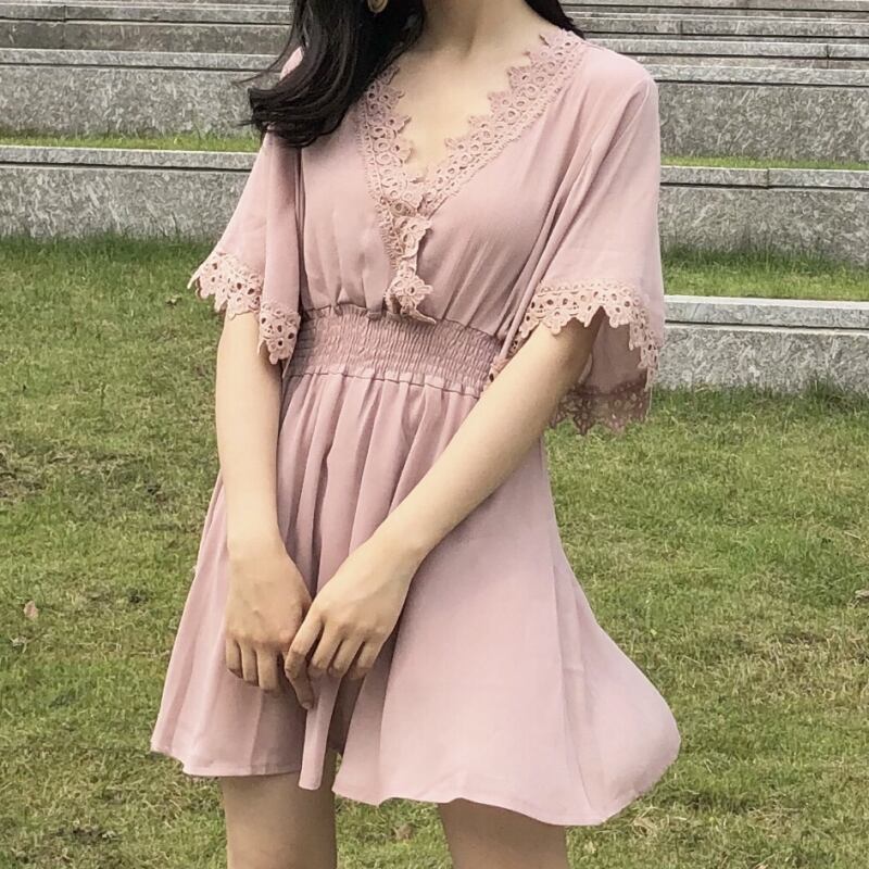 人気 韓国スタイル ドレス Vネックレース ドレス 5分袖 シフォン
