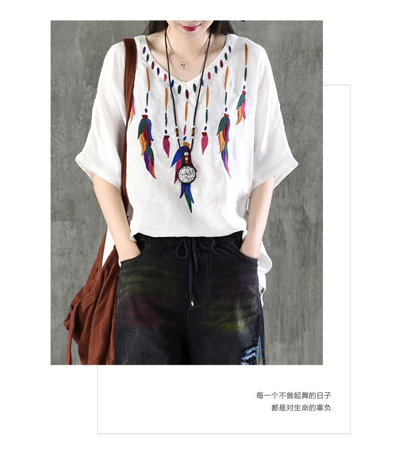 リネン 刺繍 Vネックシャツ エスニック 半袖Tシャツ