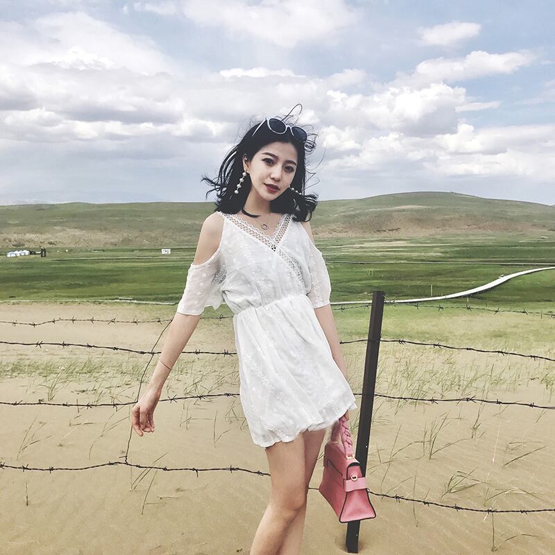 人気 韓国スタイル 刺繍ミニドレス コットンレース ショルダー