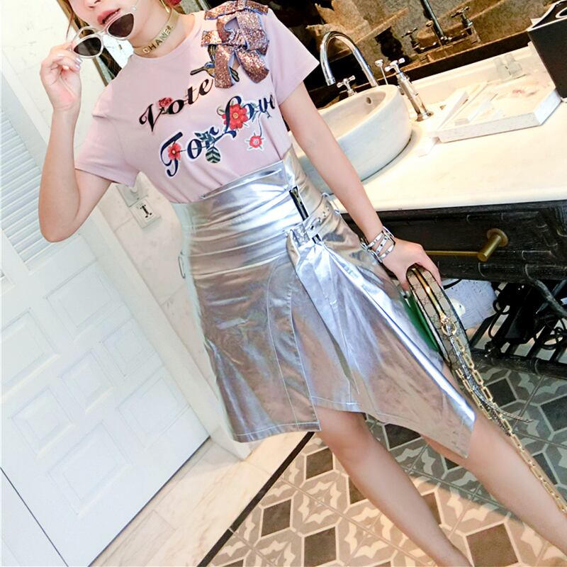 光沢のあるシルバーが未来っぽい♪ ハイウェストでアシンメトリーなデザインは脚長効果抜群!タイトなトップスと合わせるのがGood♪