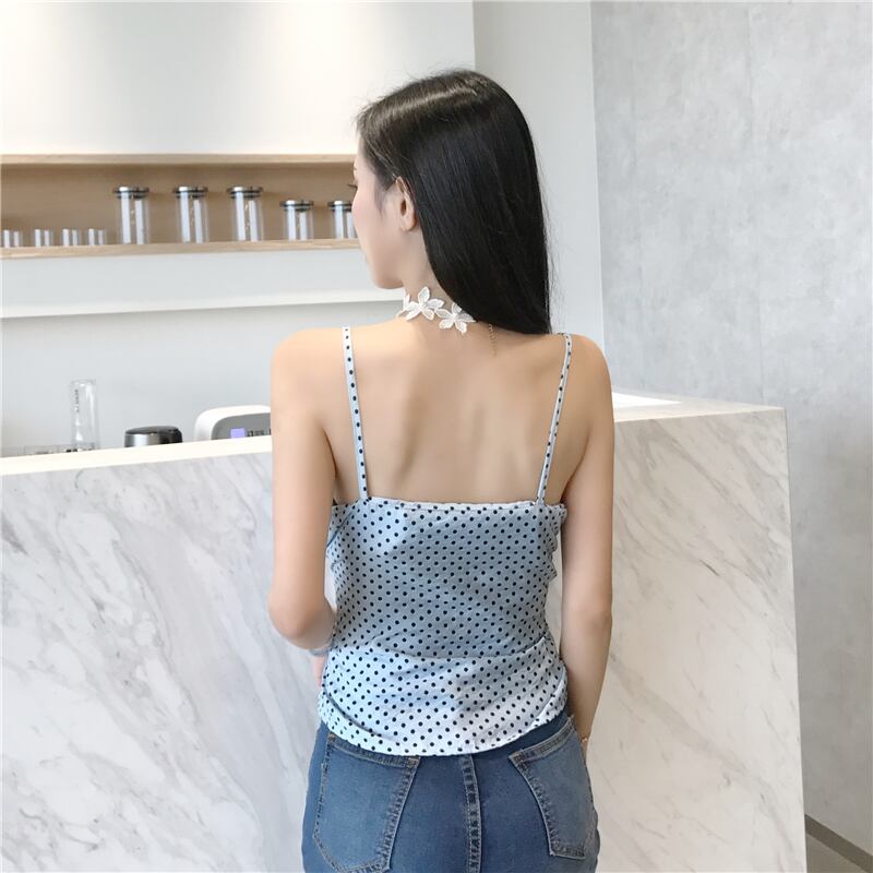 背中でも胸の下でもリボンが結べるドットのキャミソール。後ろに結ぶと可愛らしく、前で結ぶと大人っぽく。結び方で印象が変わる、爽やかなアイテム。