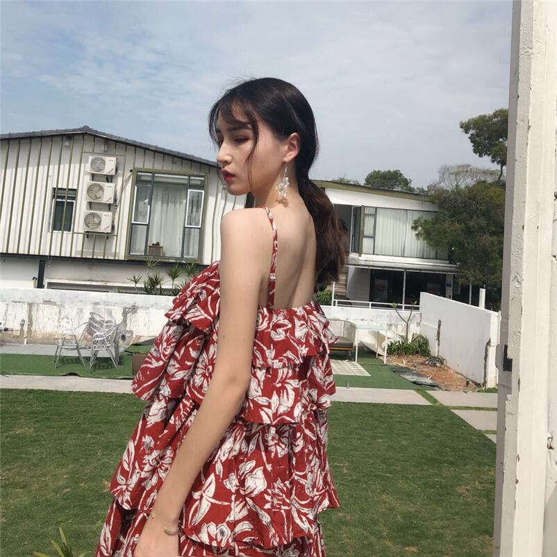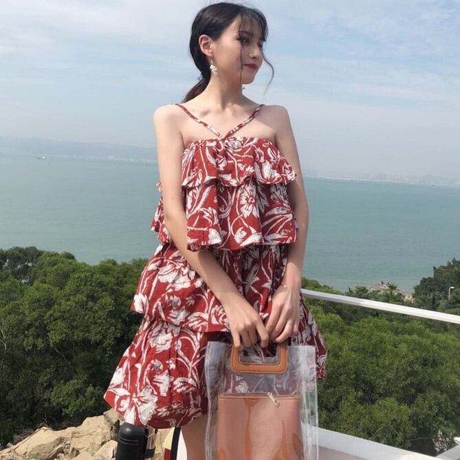 大きな花柄が個性的なフリルたっぷりのストラップドレス。リゾートにはもちろんタウンにも♪ボリュームのあるサマードレスは1枚でも目立っちゃう♪