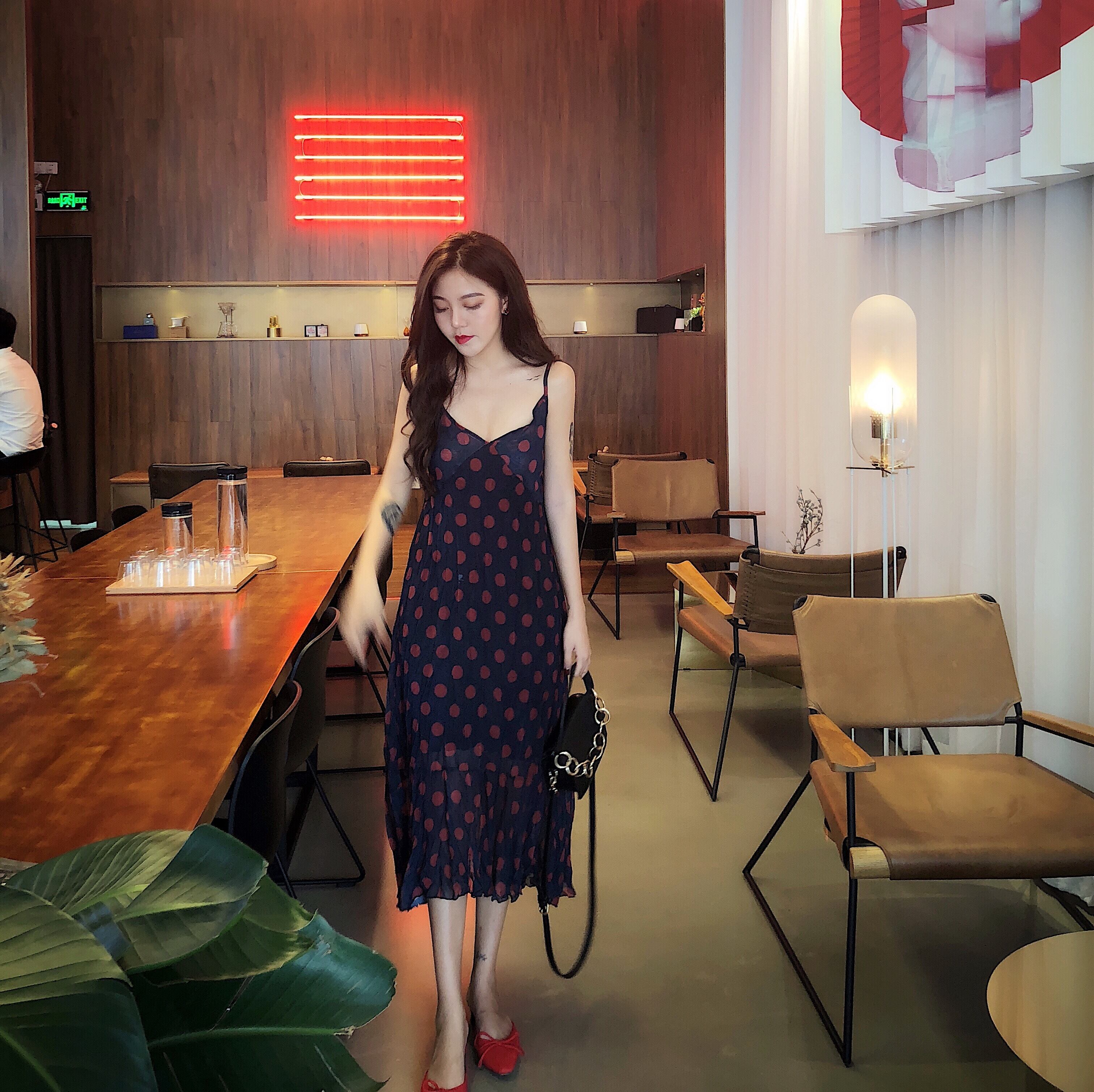 人気 韓国スタイル ドットウェーブ ストラップドレス キャミソールドレス