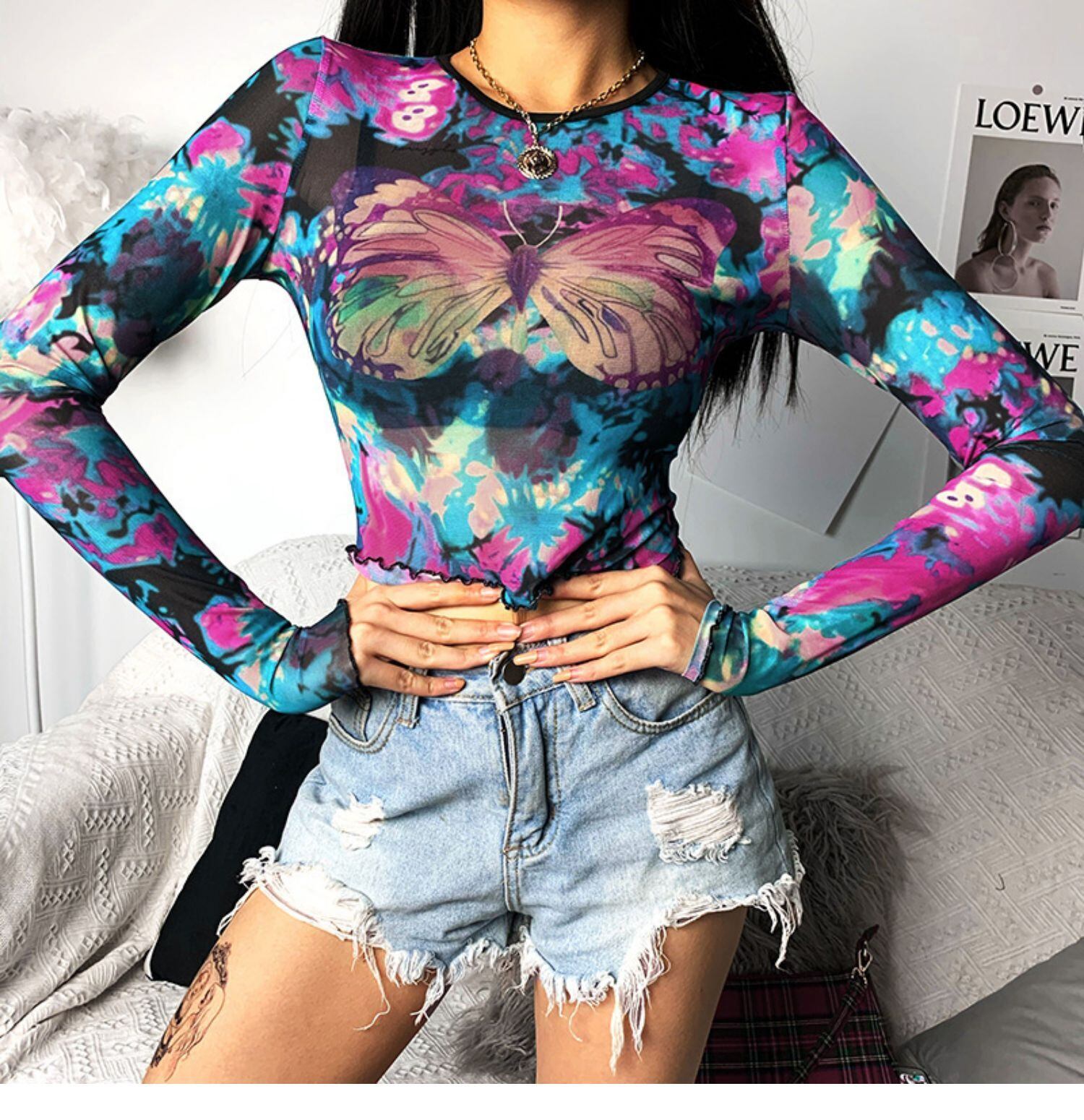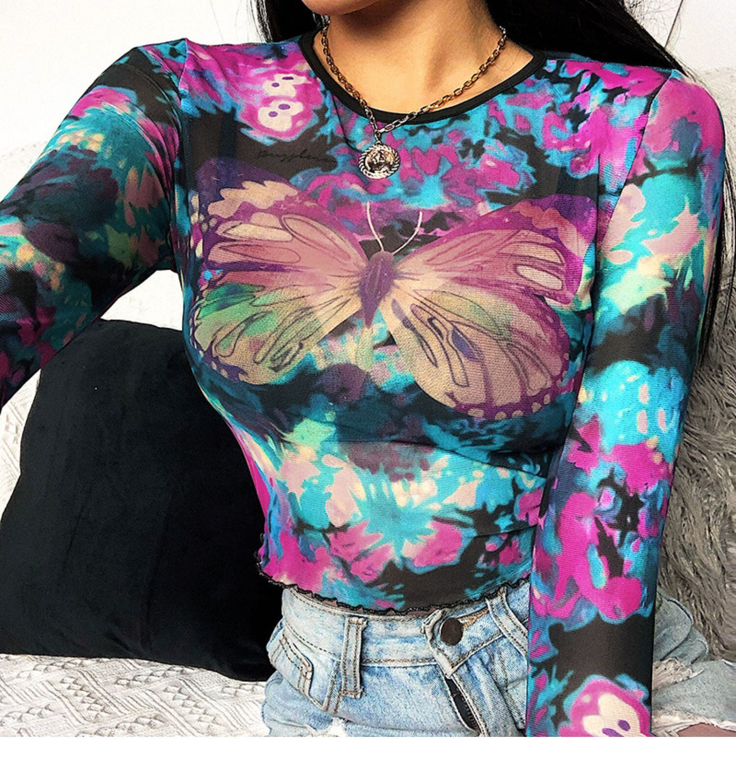 インスタバタフライプリントメッシュ長袖Tシャツ女性のヨーロッパとアメリカのinsファッションラウンドネックスリムスリミングジャケット潮 ロング Oネック ヨーロピアン instahot4223382