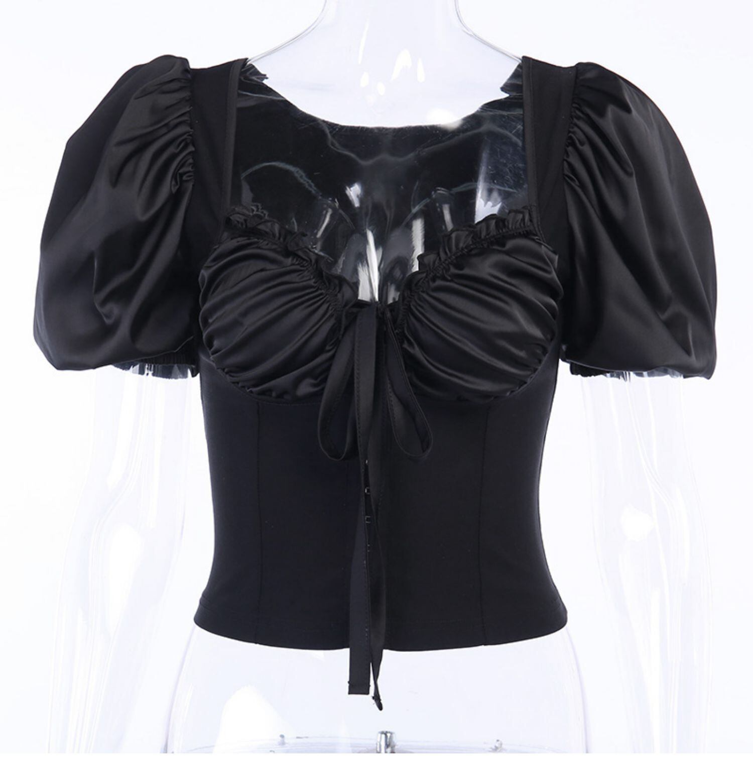 インスタレトロ宮殿スタイルのバブルスリーブブラウス女性ヨーロッパとアメリカのinsファッションスクエアカラーボウタイウエストトップ リボン レース スクウェア ヨーロピアン instahot3760616