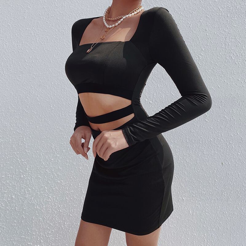 ヨーロッパとアメリカのins秋の新しい正方形の襟長袖のファッションのドレスの女性のウエストスリムスリムホールバッグヒップスカートの潮 ロング オータム 秋物 スクウェア ヨーロピアン instahot8277308