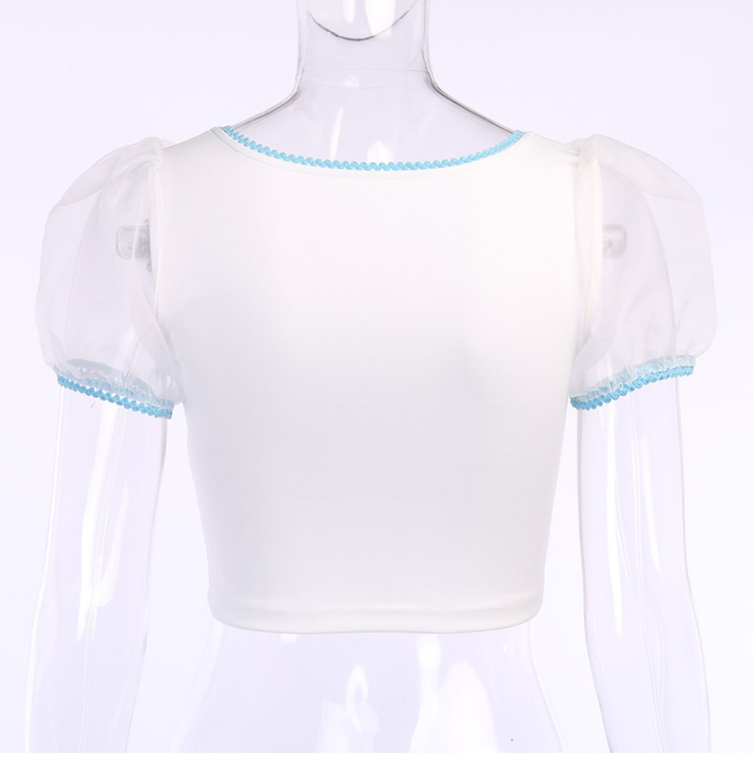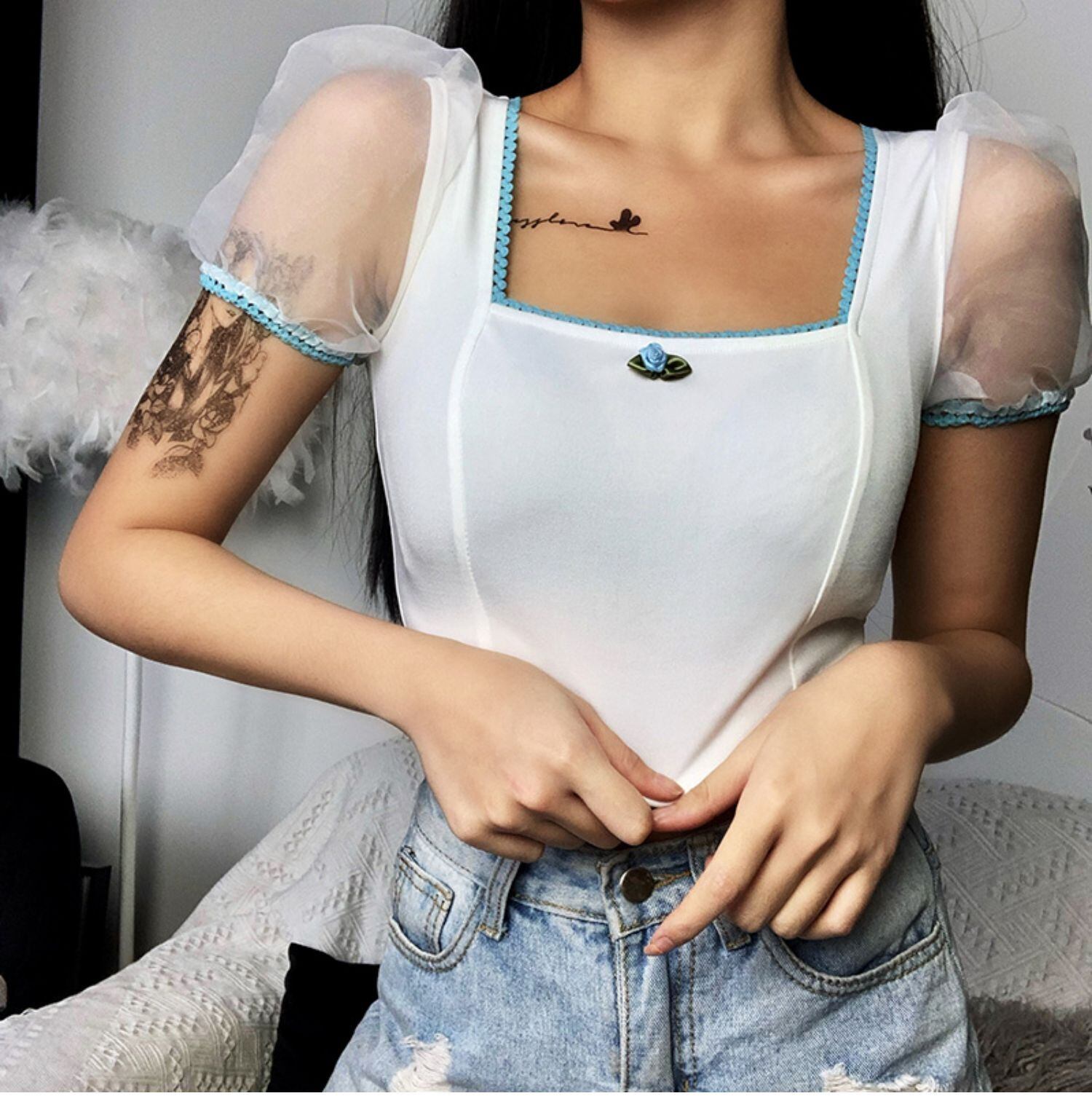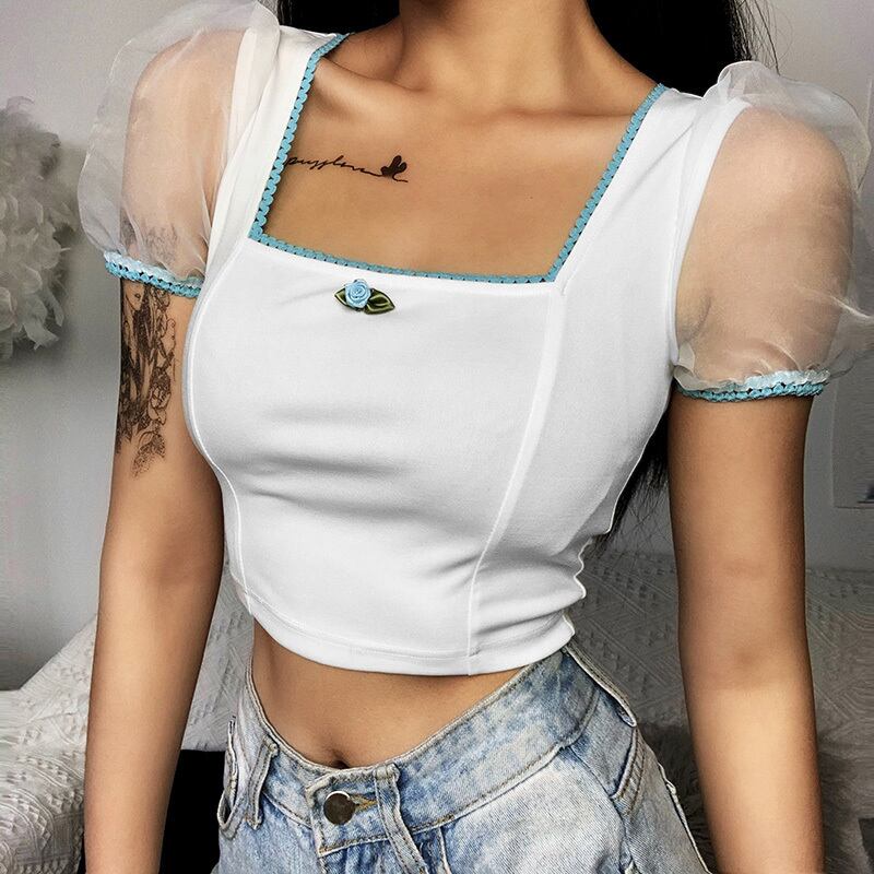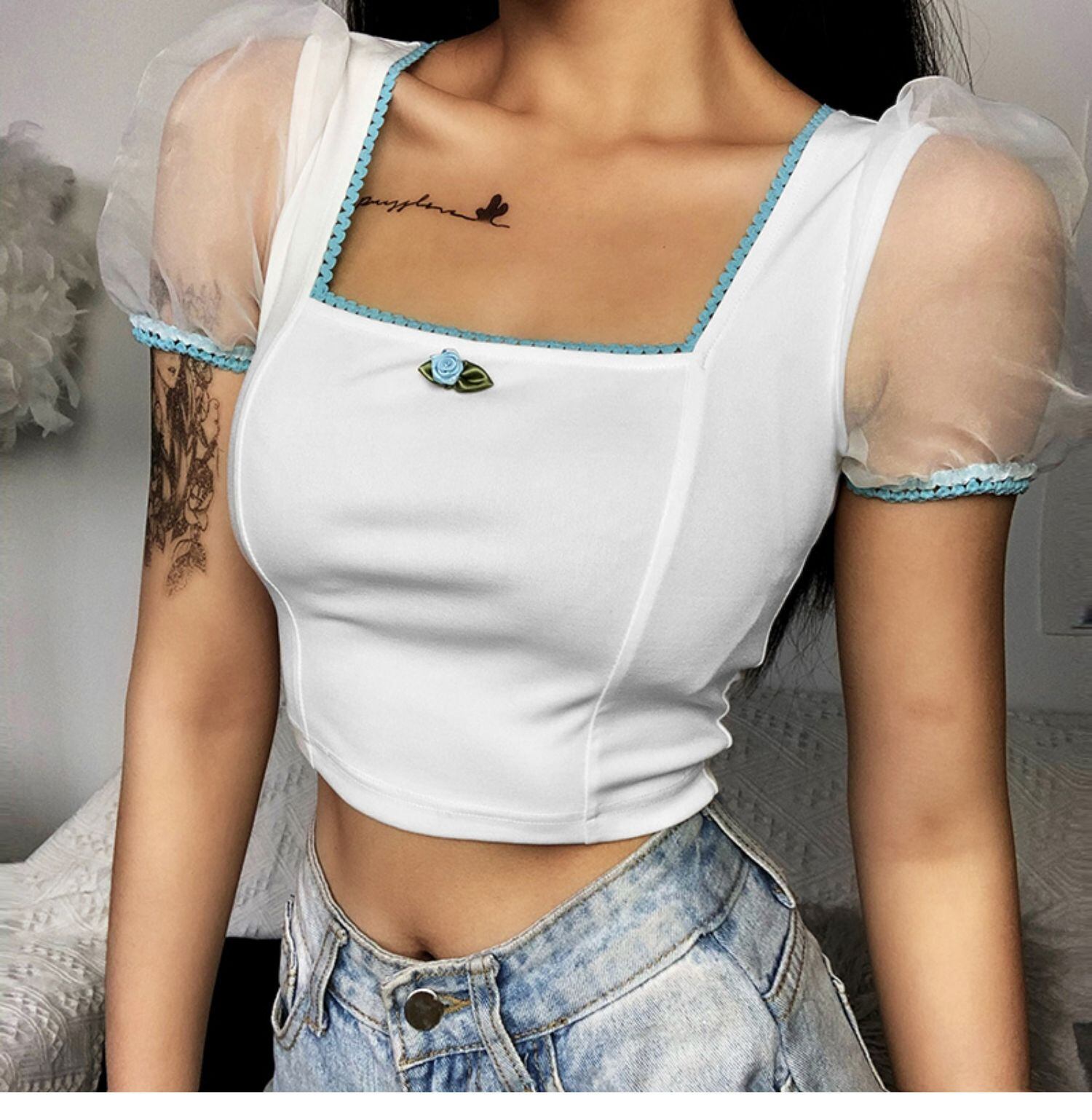 インスタメッシュステッチスクエアカラーTシャツ女性のヨーロッパとアメリカのinsスリムボディセクシーなセクシーなおへそショートトップ スクウェア ヨーロピアン instahot3087825