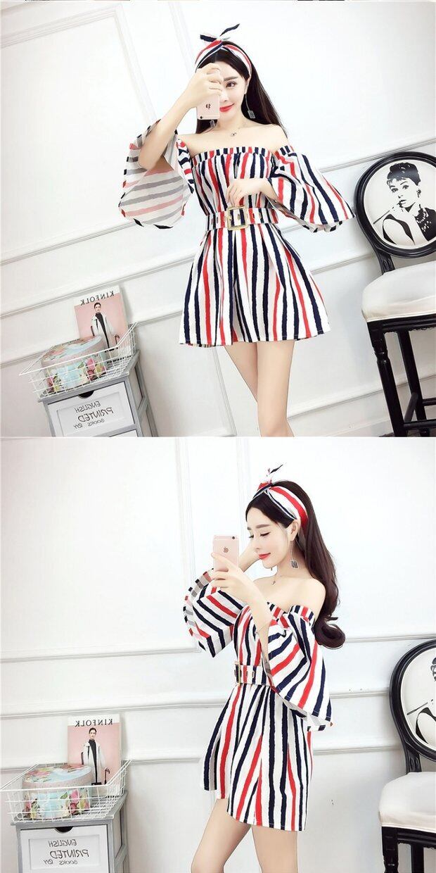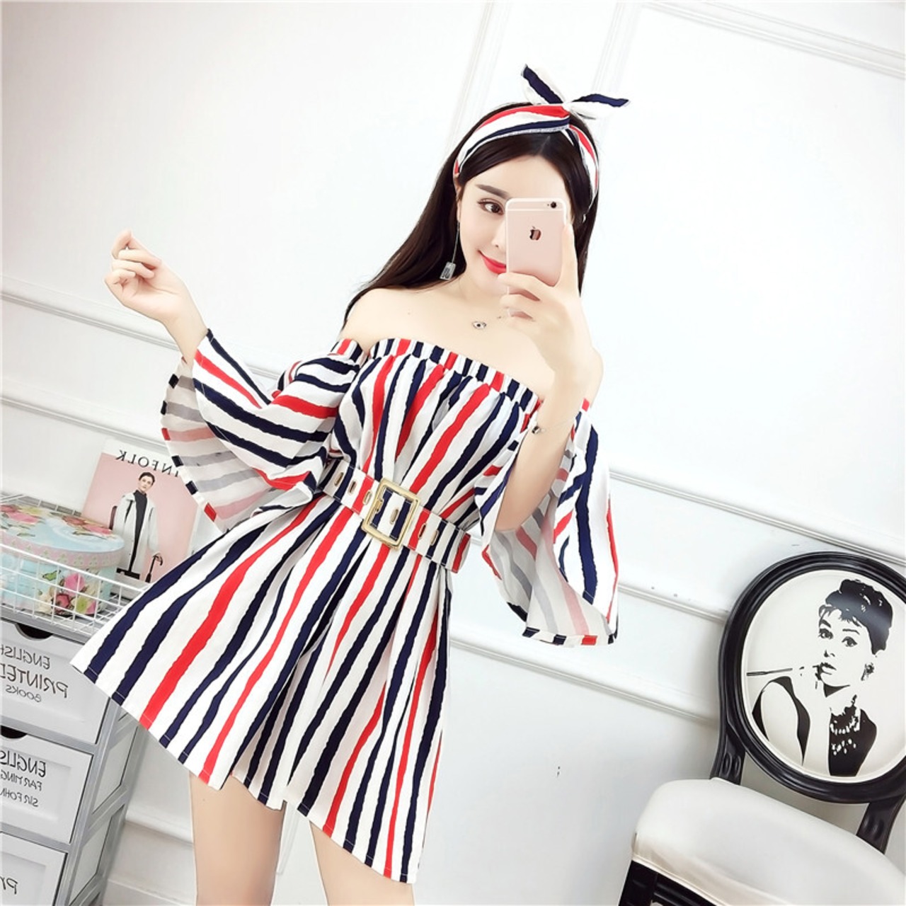 2020夏の新しいファッションセクシーなハイウエストの緩いストライプは薄い単語の襟ストラップレスのフレアスリーブドレスの女性でした ハイウェスト レッド サマー 夏物 Sexy韩衣坊8817094