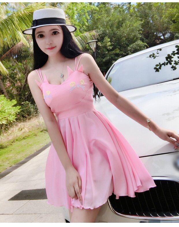 甘い気質の猫刺繍サスペンダースカート2020夏の新しい女性の服は薄く、シフォンドレス レッド 大人ガーリー スウィート キュート カジュアル サマー 夏物 Sexy韩衣坊0268430