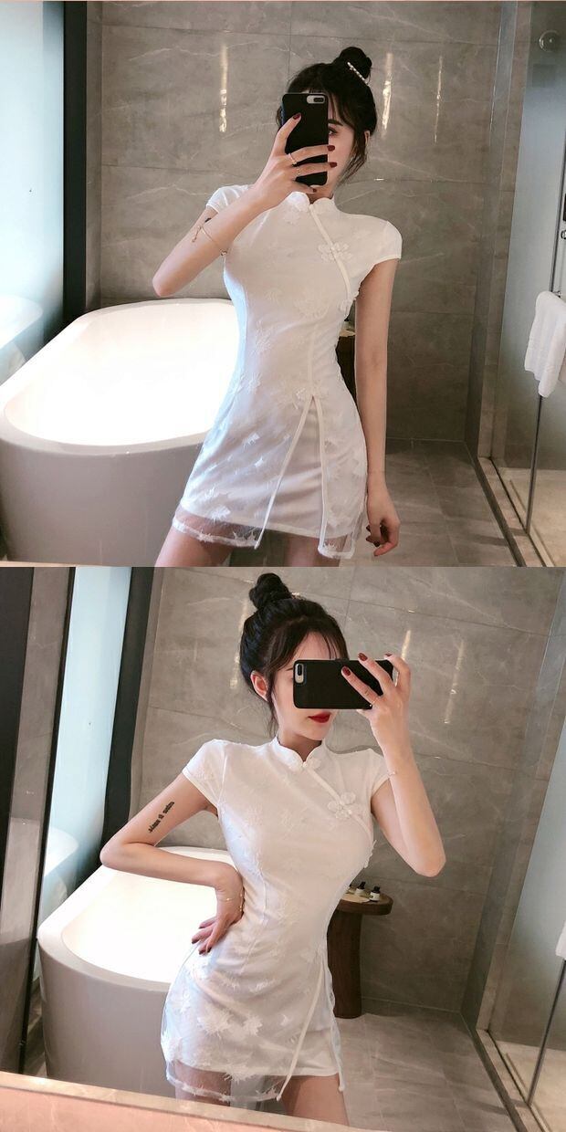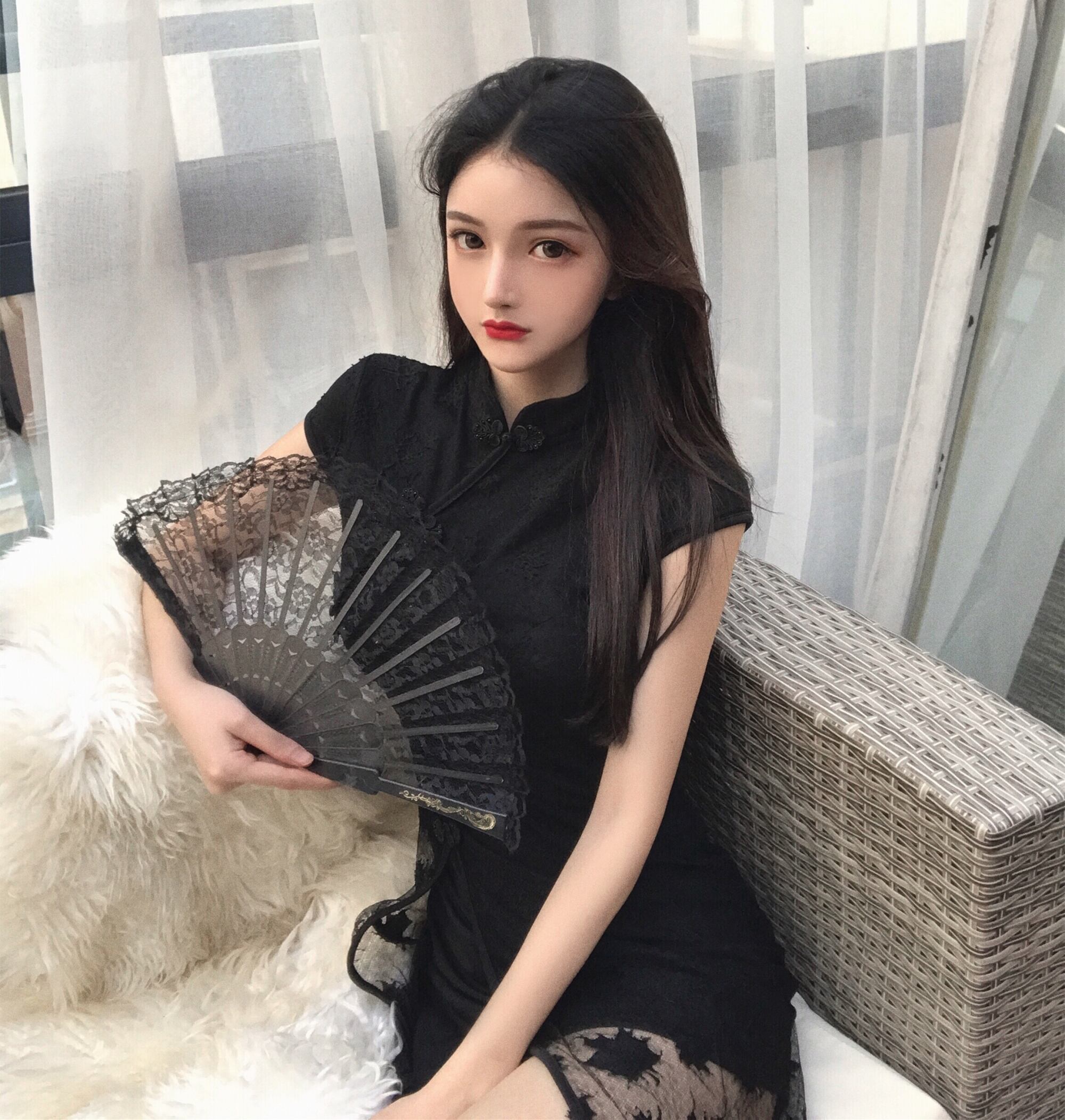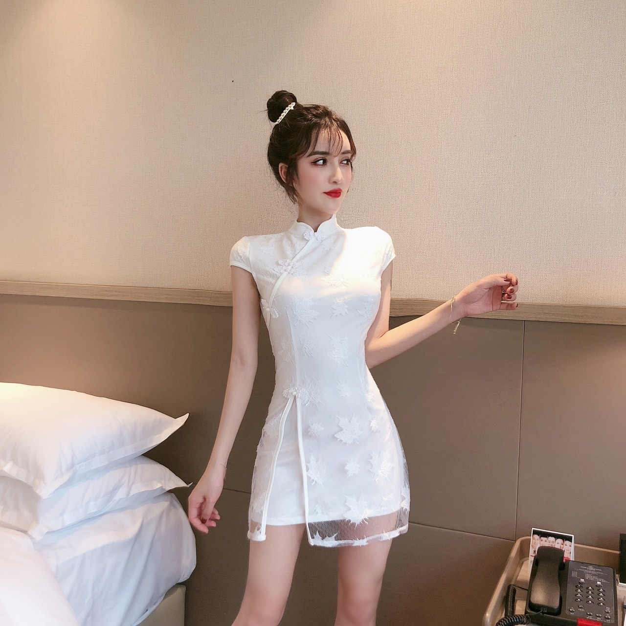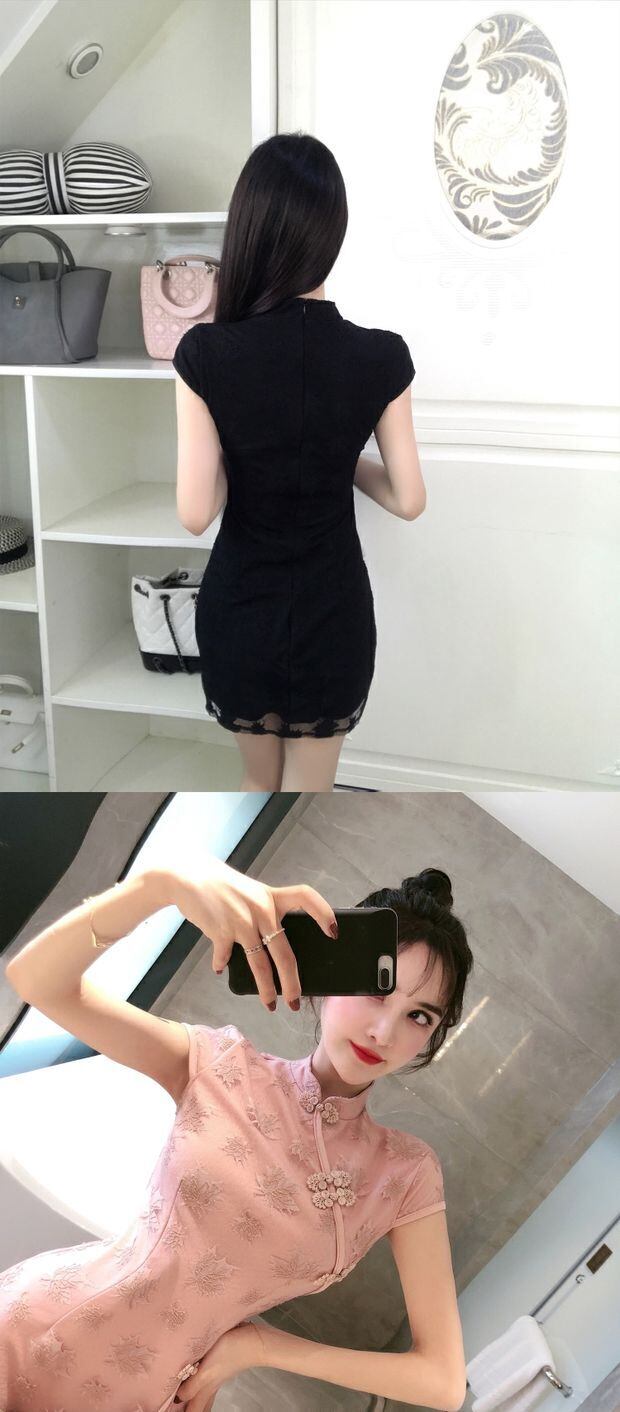 若いチャイナスタイルの香港スタイルの毎日の気質のレースのステッチセクシーな分割レトロなウエストバンドヒップ半袖ドレス ショート ハーフスリーブ Sexy韩衣坊6295382