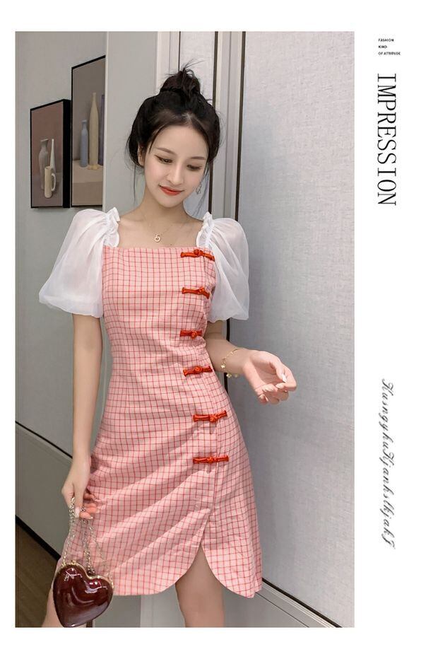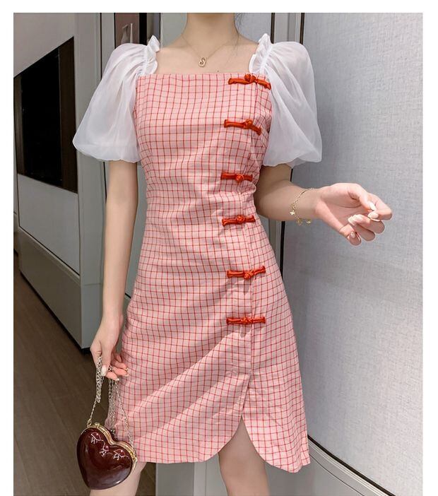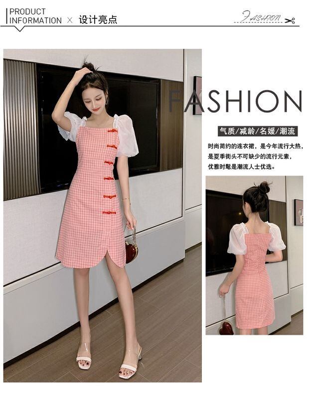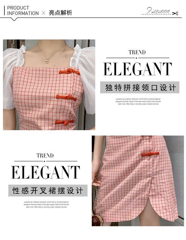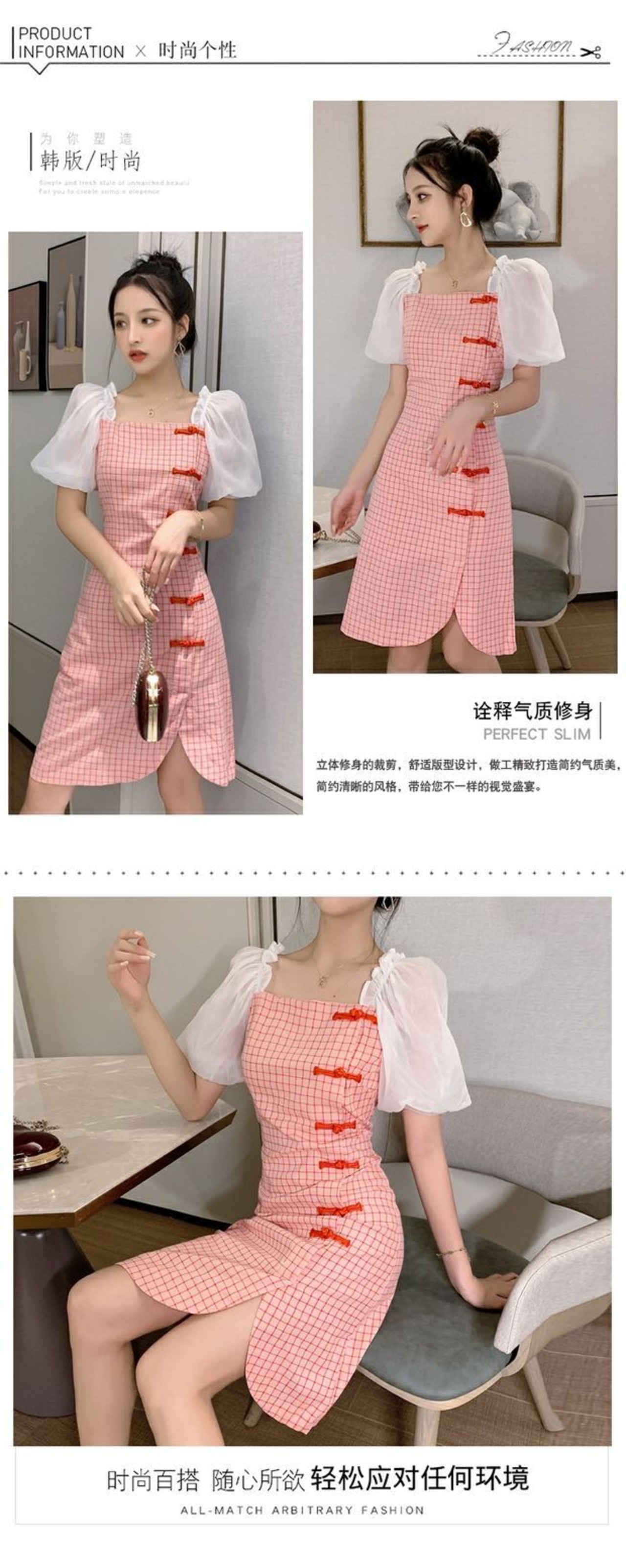 2020夏の新しい慎重なマシン分割改良チャイナステッチシフォンパフスリーブウエストセクシーなドレス潮 サマー 夏物 Sexy韩衣坊6692575