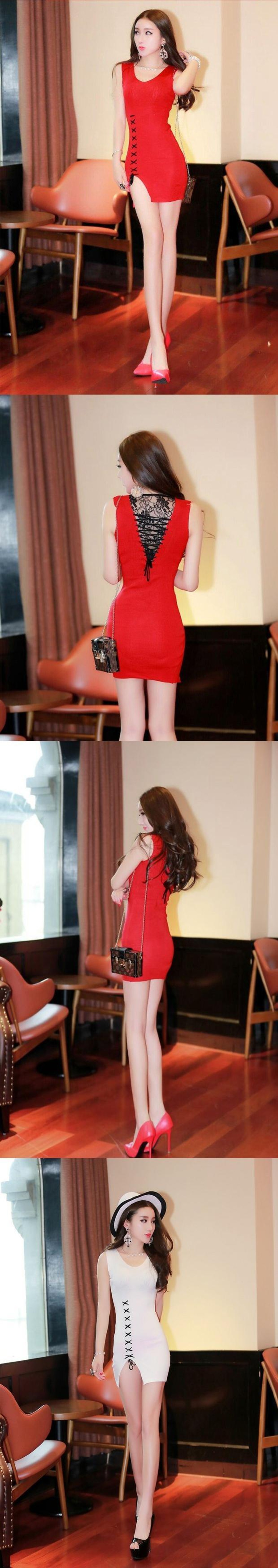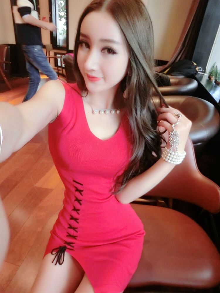 2020夏のセクシーなナイトクラブレディースレディースレースアップVネックスプリットタイトノースリーブバッグヒップニットドレス潮 サマー 夏物 Sexy韩衣坊4526299