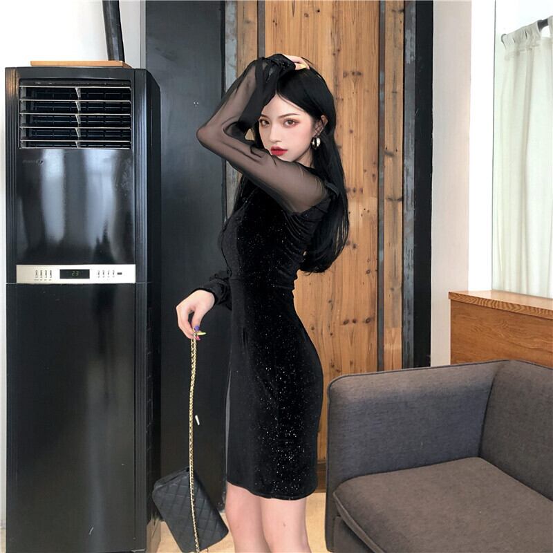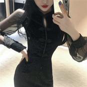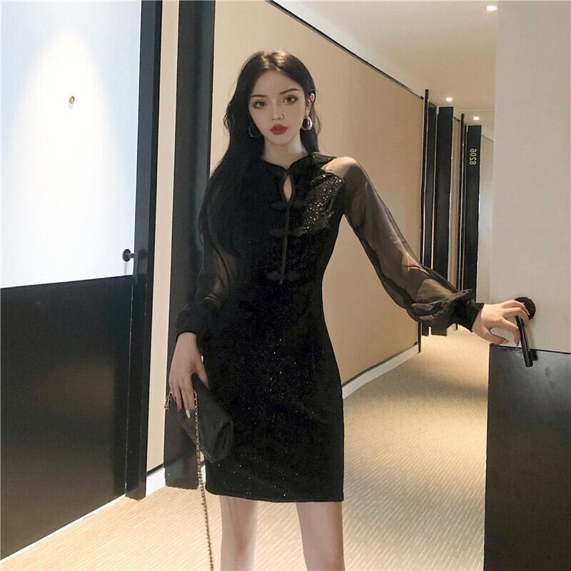 2020秋と冬の女性のヘプバーン小さな黒いスカート気質パッケージヒップウエストチャイナドレス改良版ドレス ブラック オータム 秋物 ウィンター 冬物 Sexy韩衣坊9726133