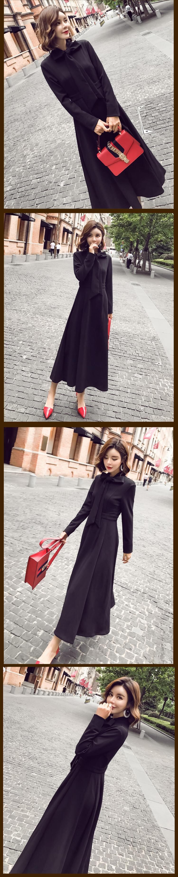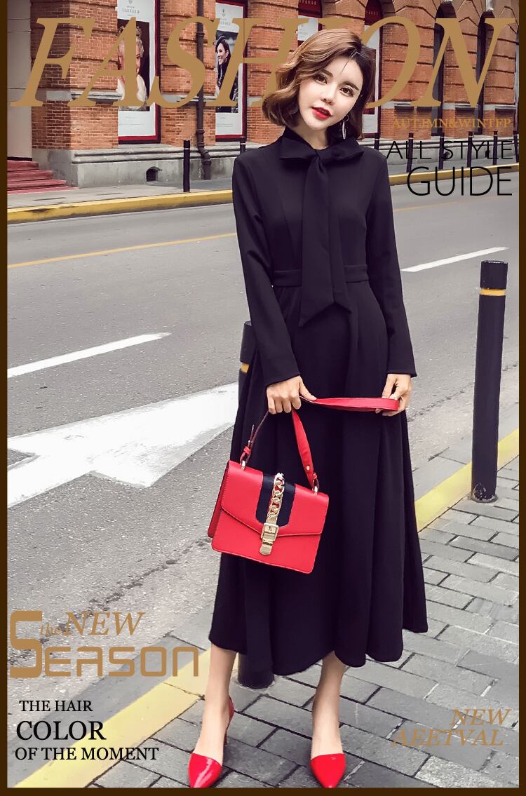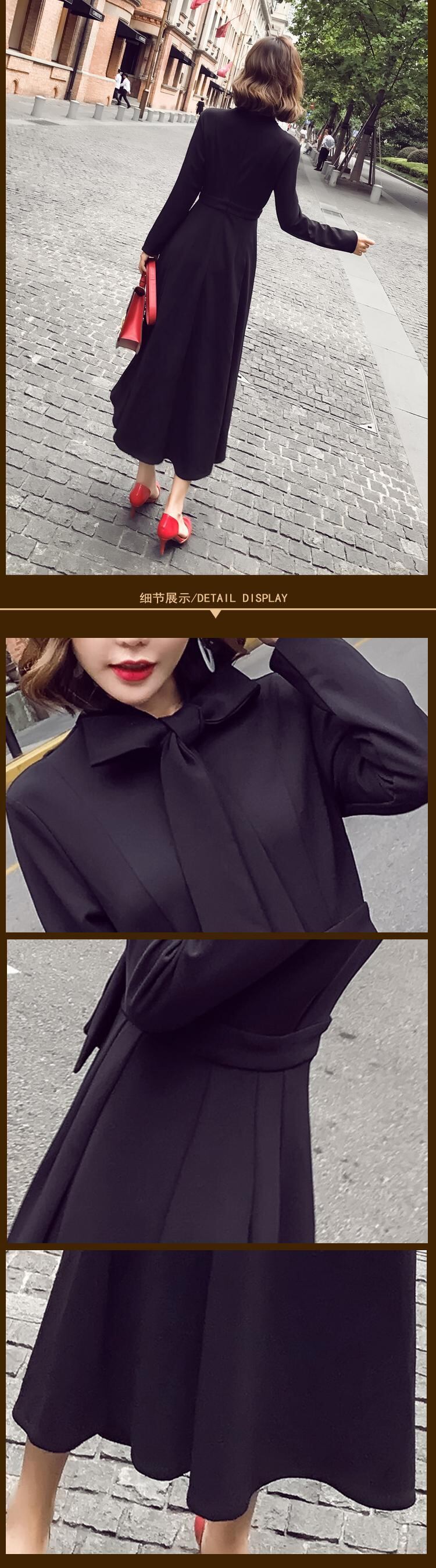 毎日特別オファー秋のヘプバーンちょう結びの黒のドレスバージョンのレトロな気質スリム長袖のドレスロングスカートの女性 ブラック リボン オータム 秋物 DESIRE_DESIGN3553944