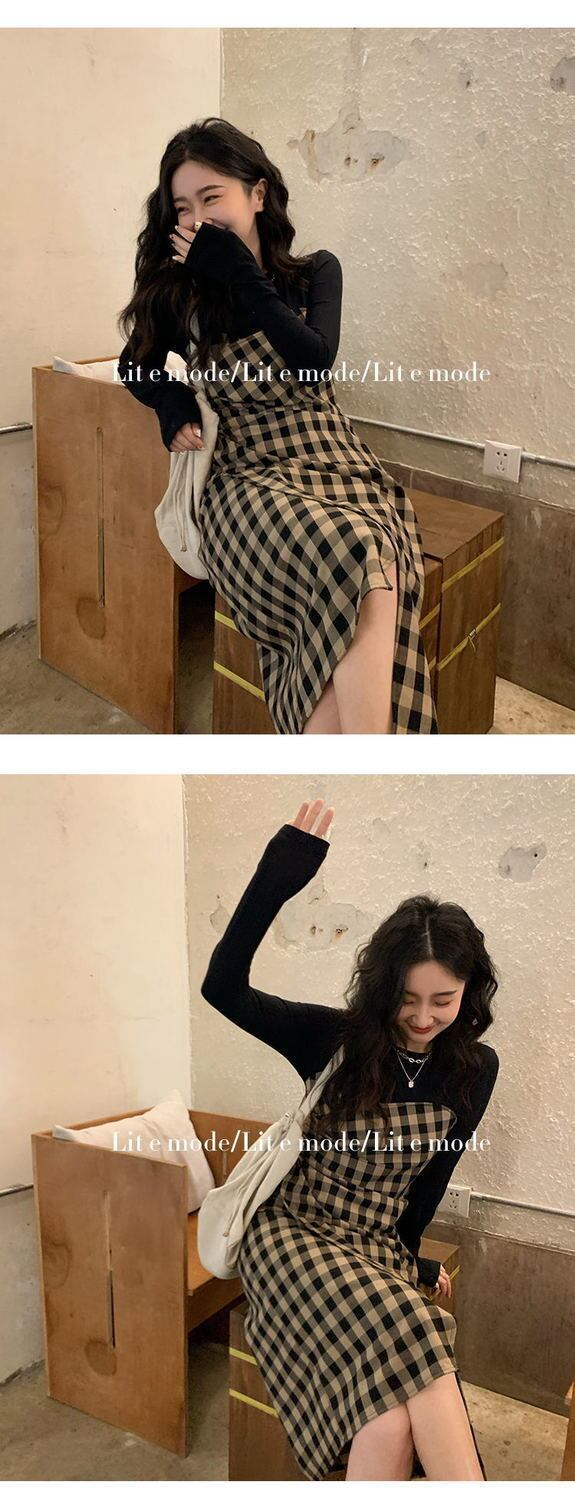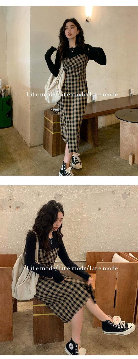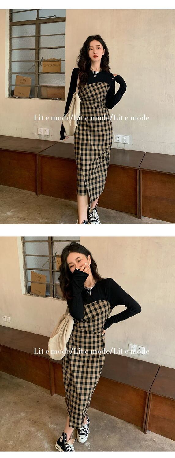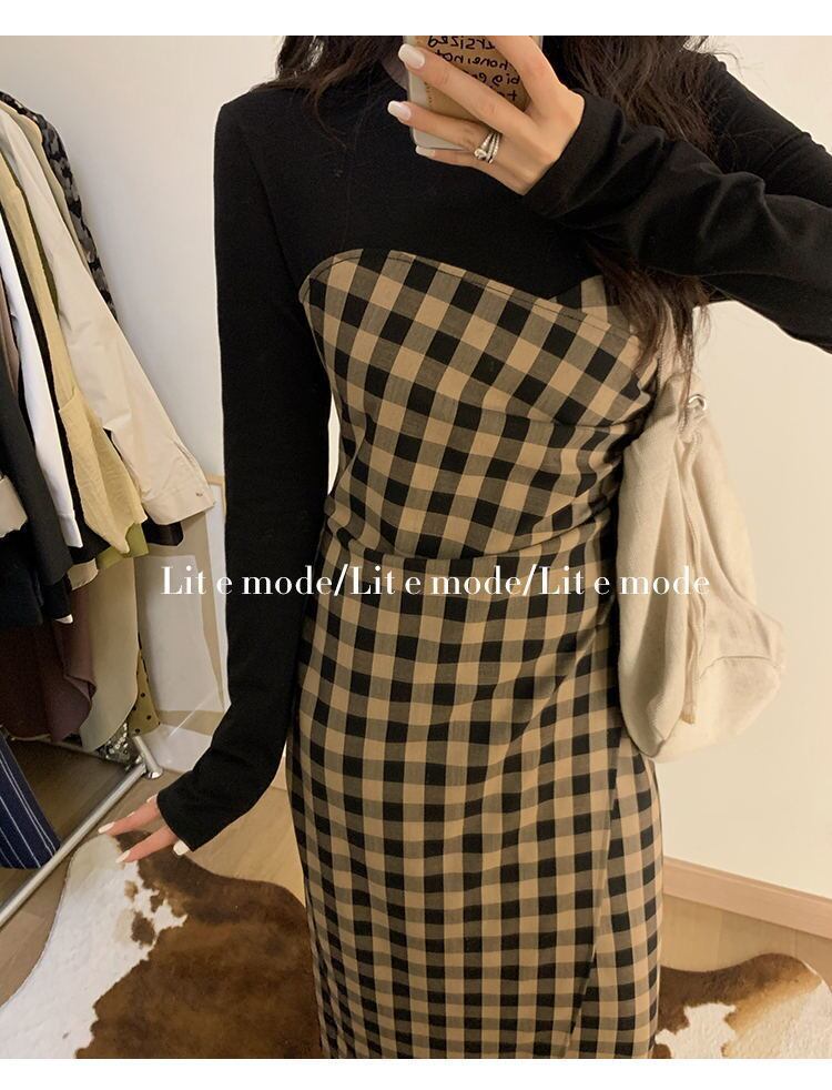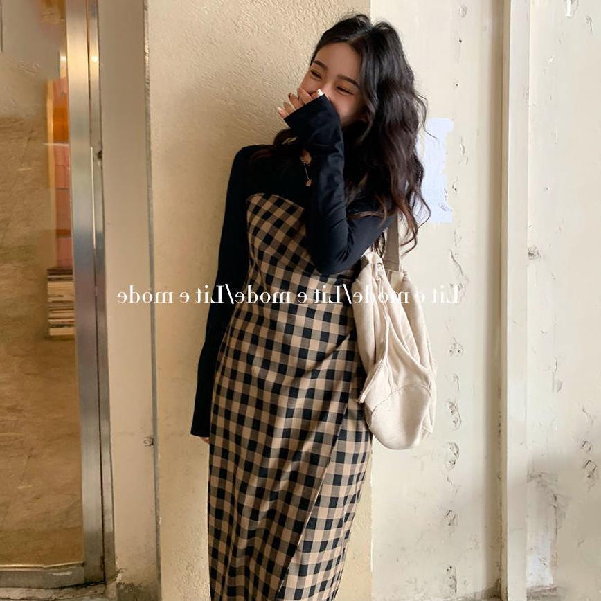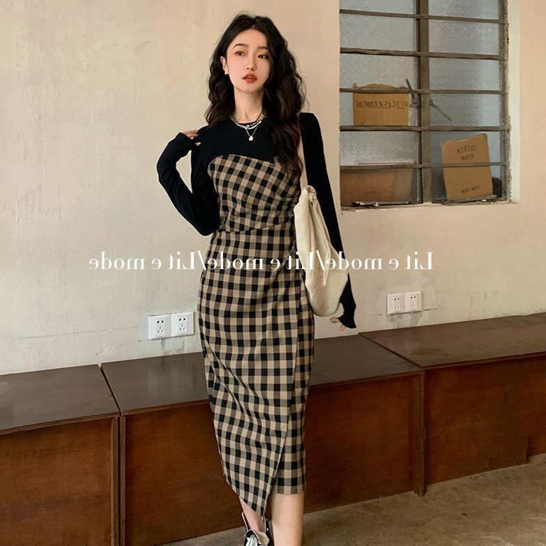 スタンダードスタイル格子柄ドレス スプリングオータムウェスト薄手スカート ロング レトロ 春物 秋物 ステッチ 普寧45105058148