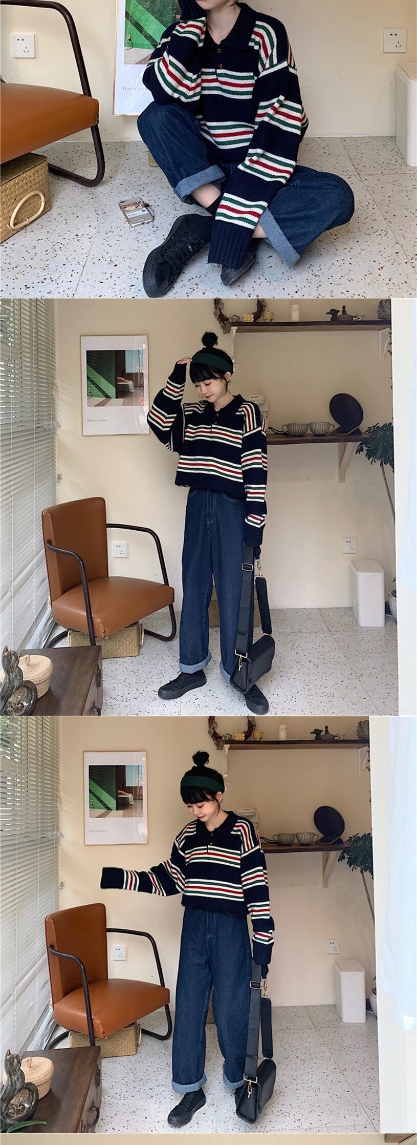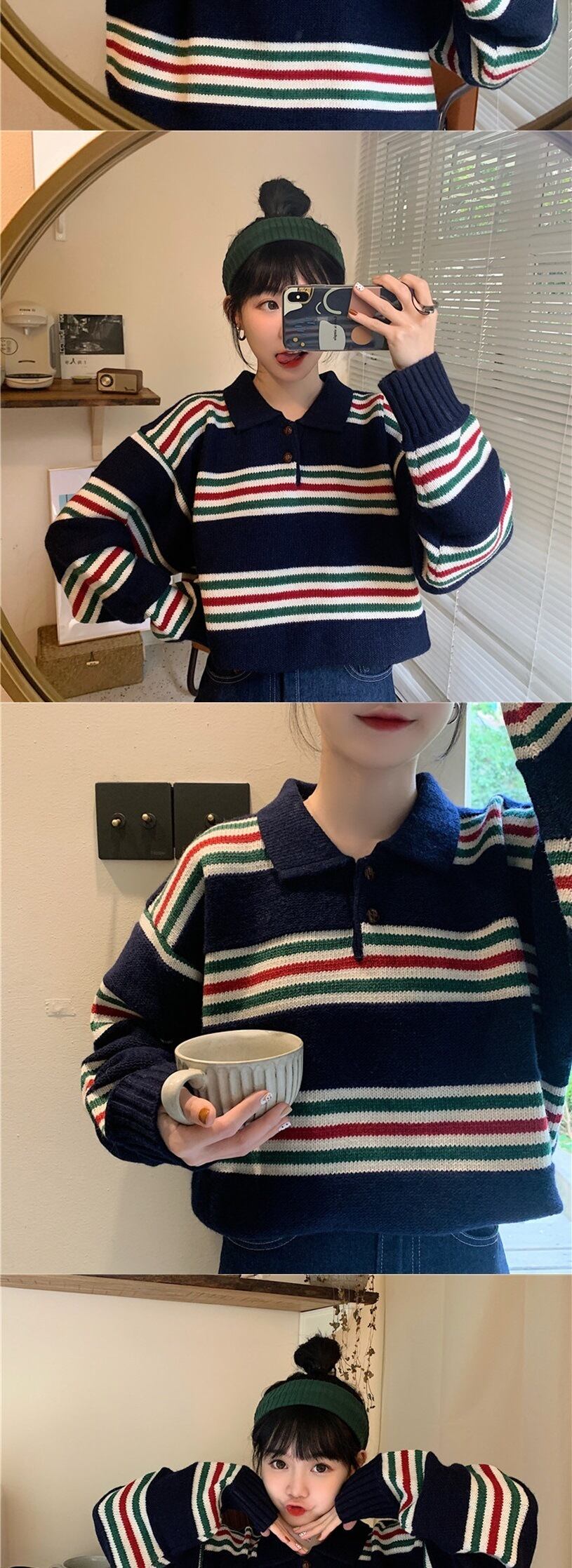 スプリングオータムニットトップス カラーストライプセーター 大きめサイズ 春物 秋物 普寧53637031120