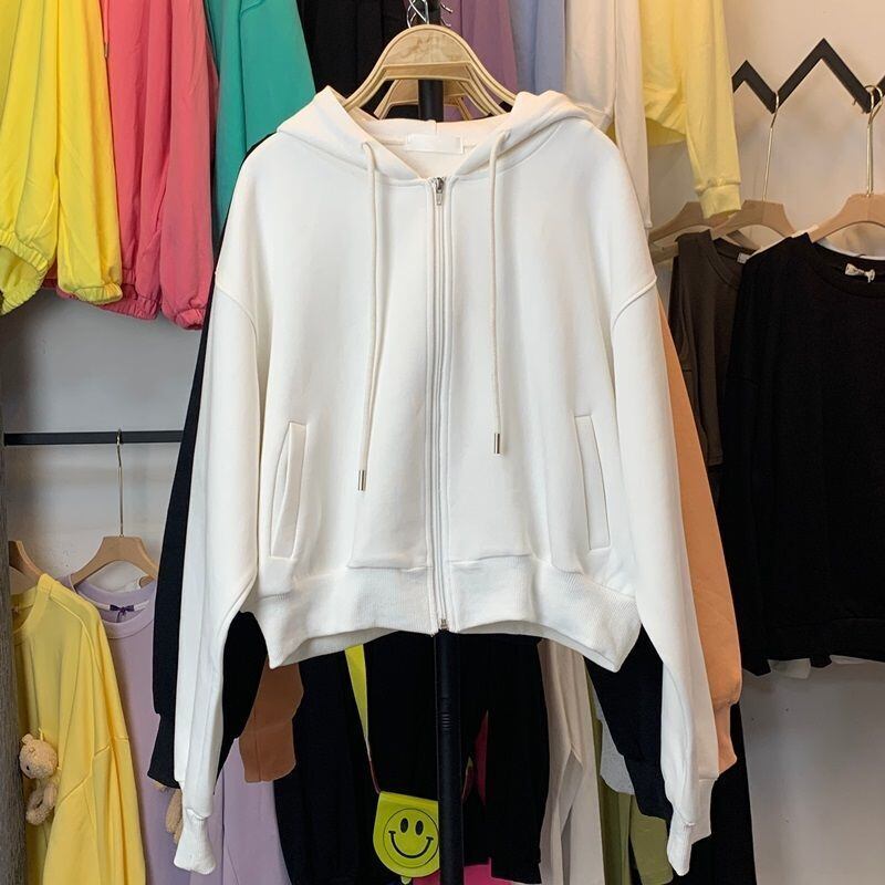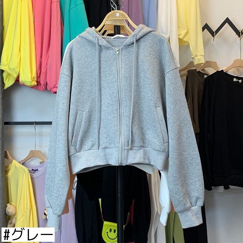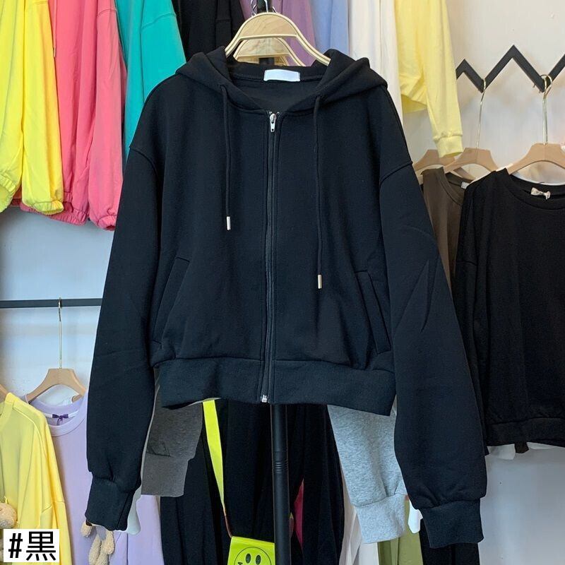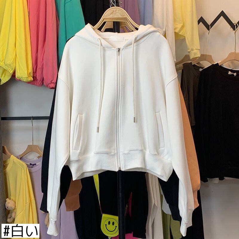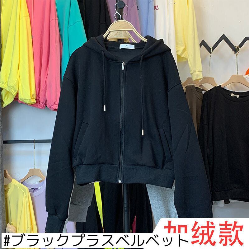 オータムウィンタースタイルショートフードセーター レディースベルベットルーズカーディガンジッパージャケット 秋物 冬物 普寧43506106820