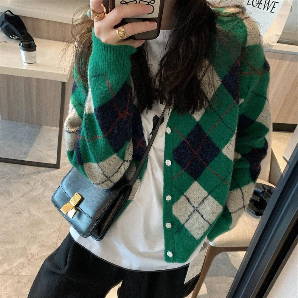 Vネックニットカーディガンルーズオータムウィンターグリーンスタンダードセーター ジャケット レディース レトロ 秋物 冬物 普寧41174033875