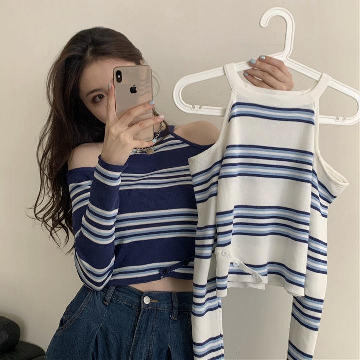 セーター オータムスリムストライプトップス ロング 秋物 普寧20101327545