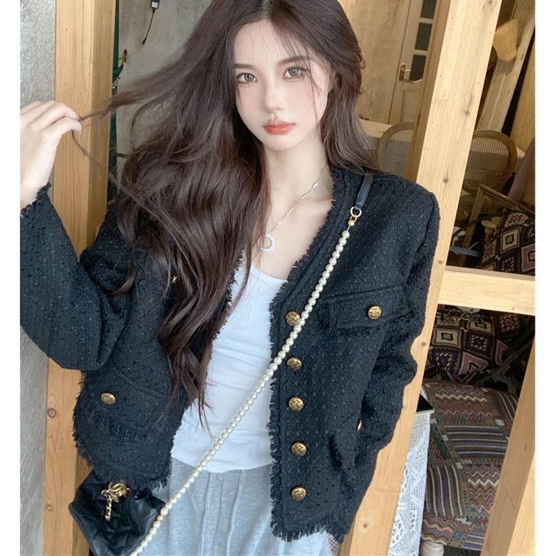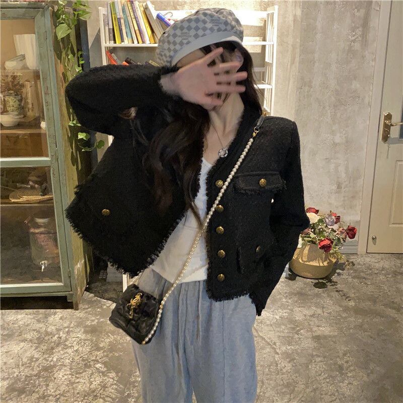 ジャケット レディースオータムスタイルショートルーズVネックスタンダードブラックトップス ロング レトロ 秋物 普寧46625980067