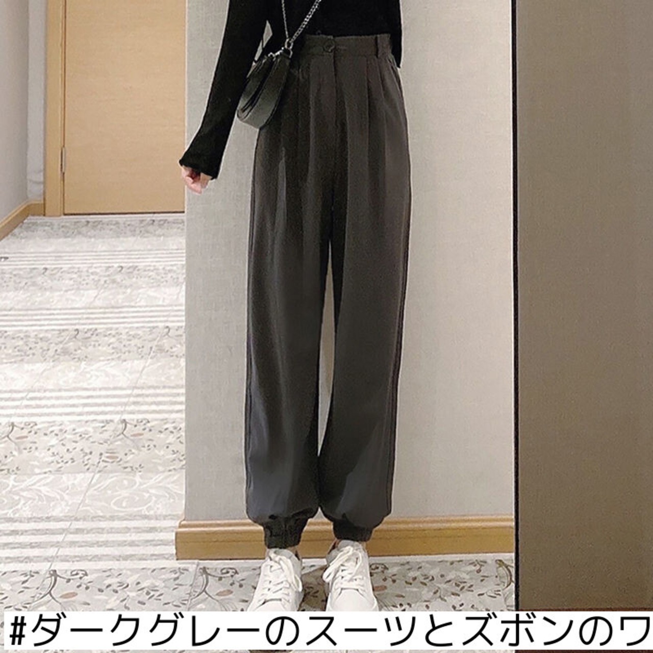 色:黒のオープンラインブラウス+ダークグレーのスーツとネクタイパンツスーツ,ブラックオープンライニングトップワンピース,ダークグレーのスーツとズボンのワンピース