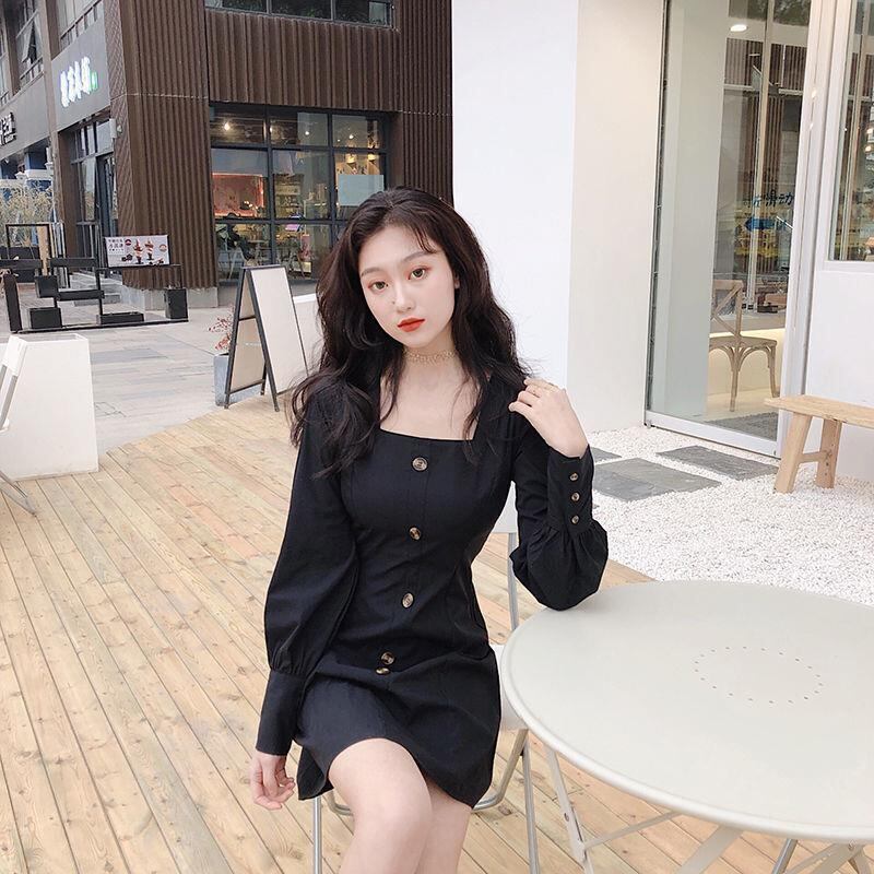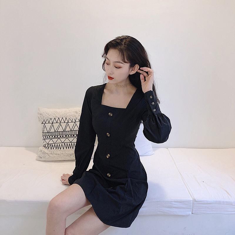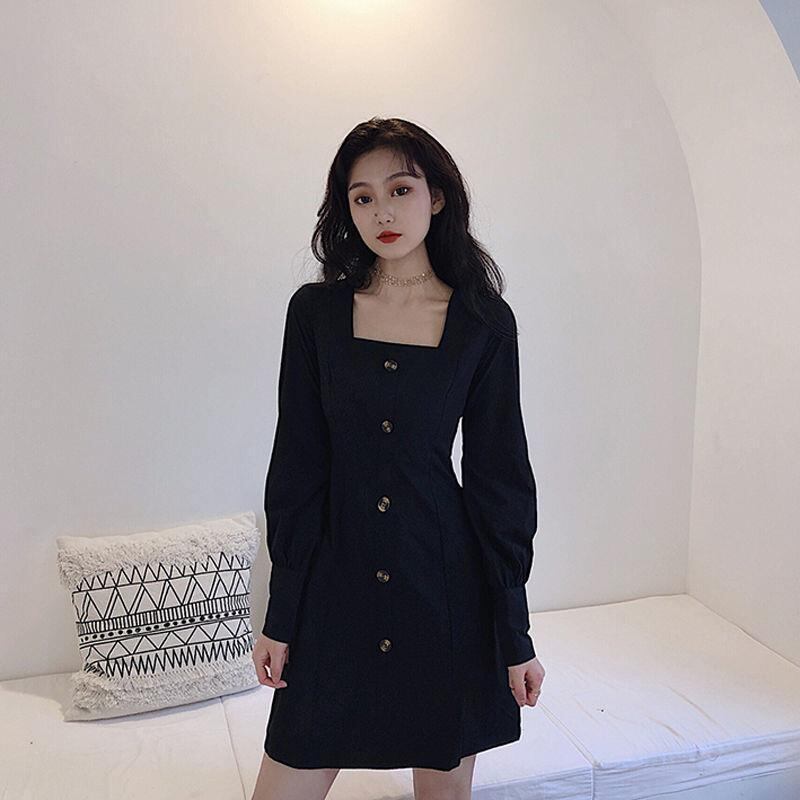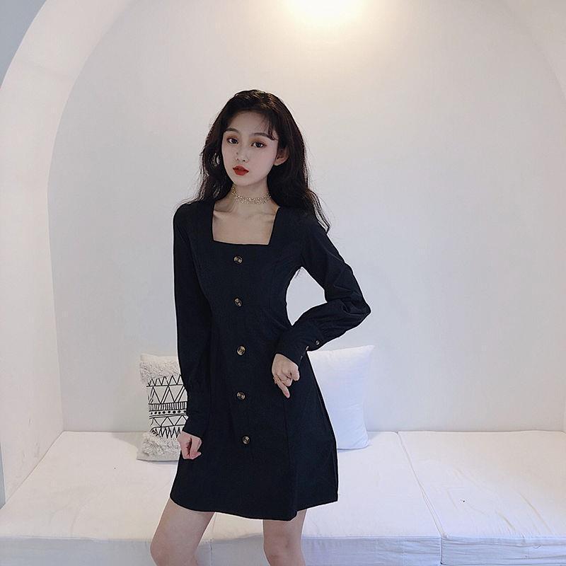 カラーブラックドレス 長袖スリーブショートスカート スプリングオータム ロング 大きめサイズ 春物 秋物 スクウェア 普寧99194732932