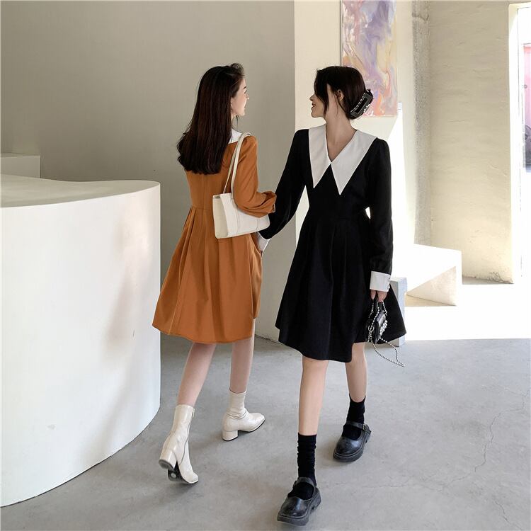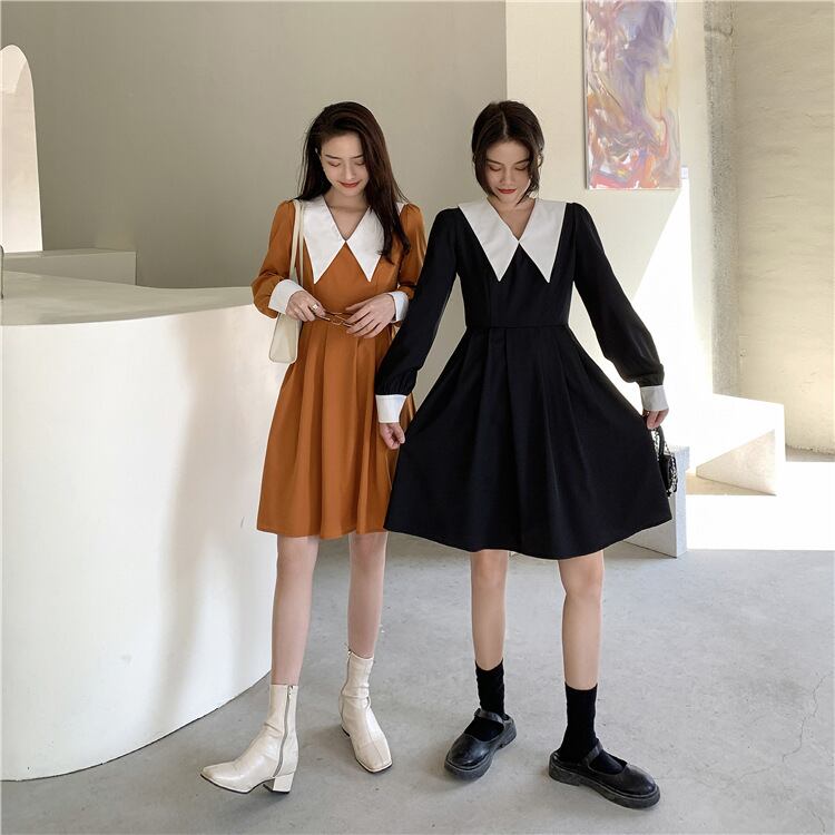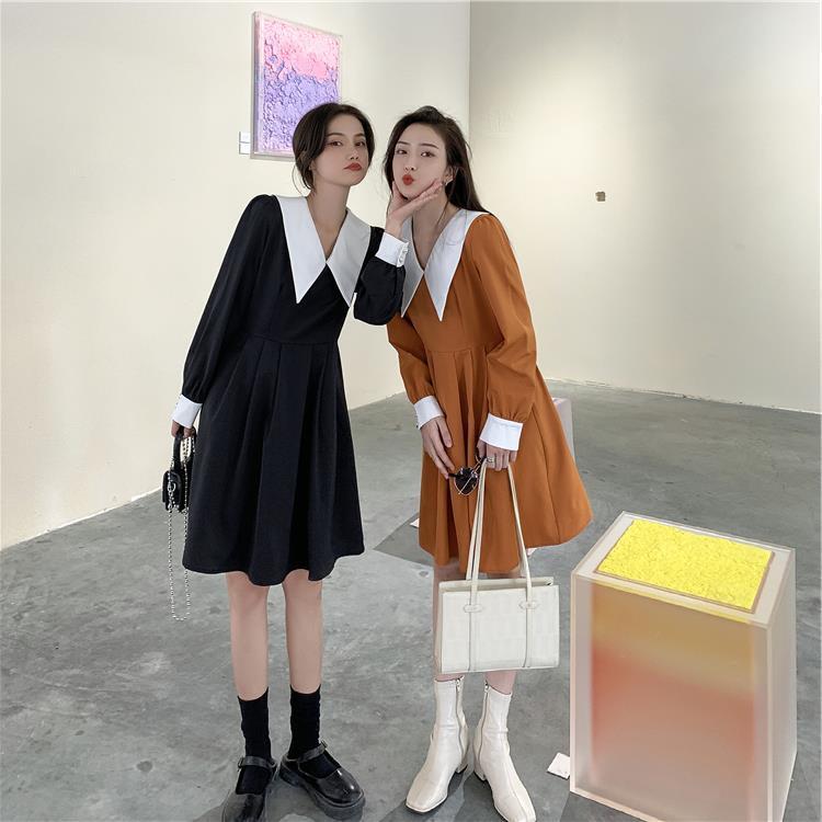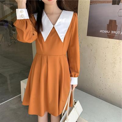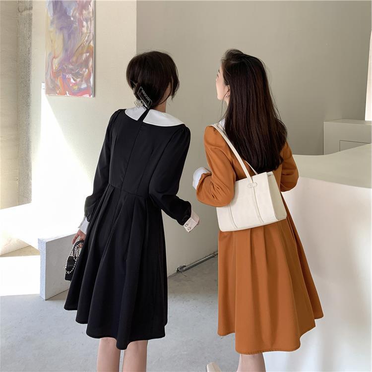 カラースカート 長袖スリーブスタンダードスリムウェストドレス ロング レトロ 普寧59124899002