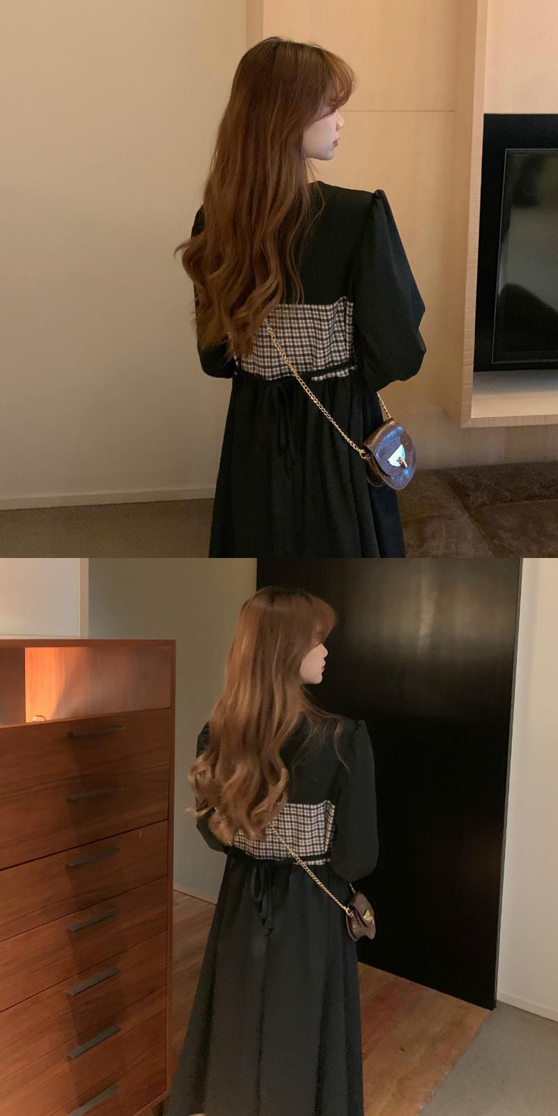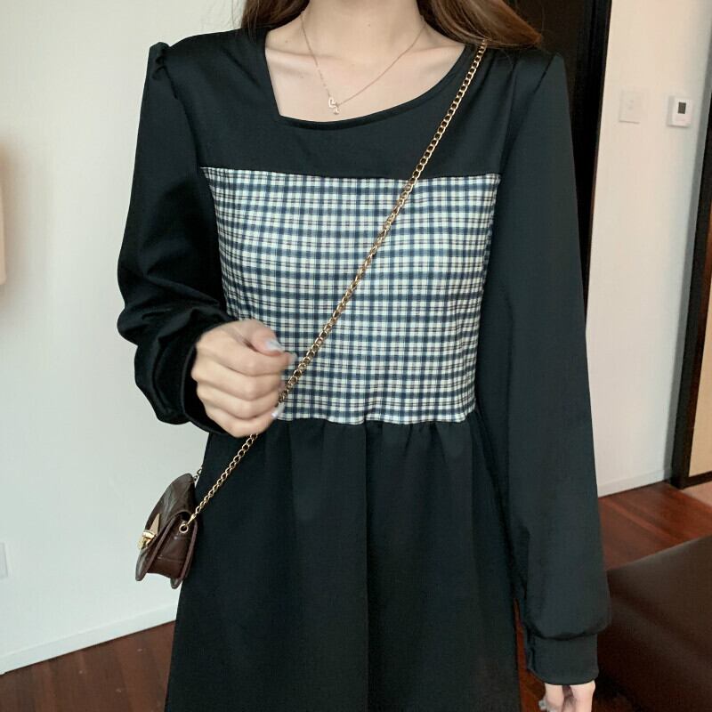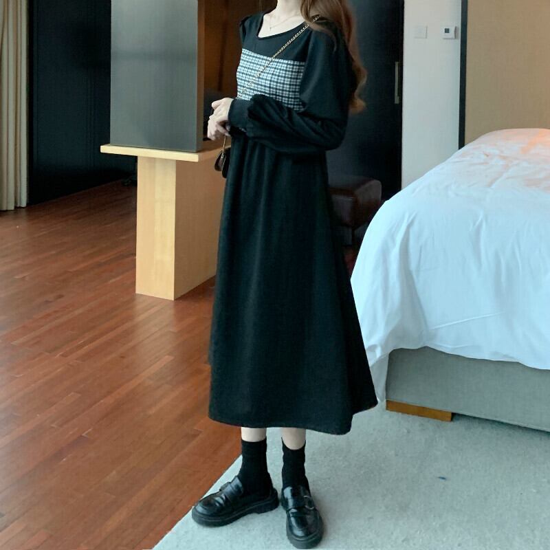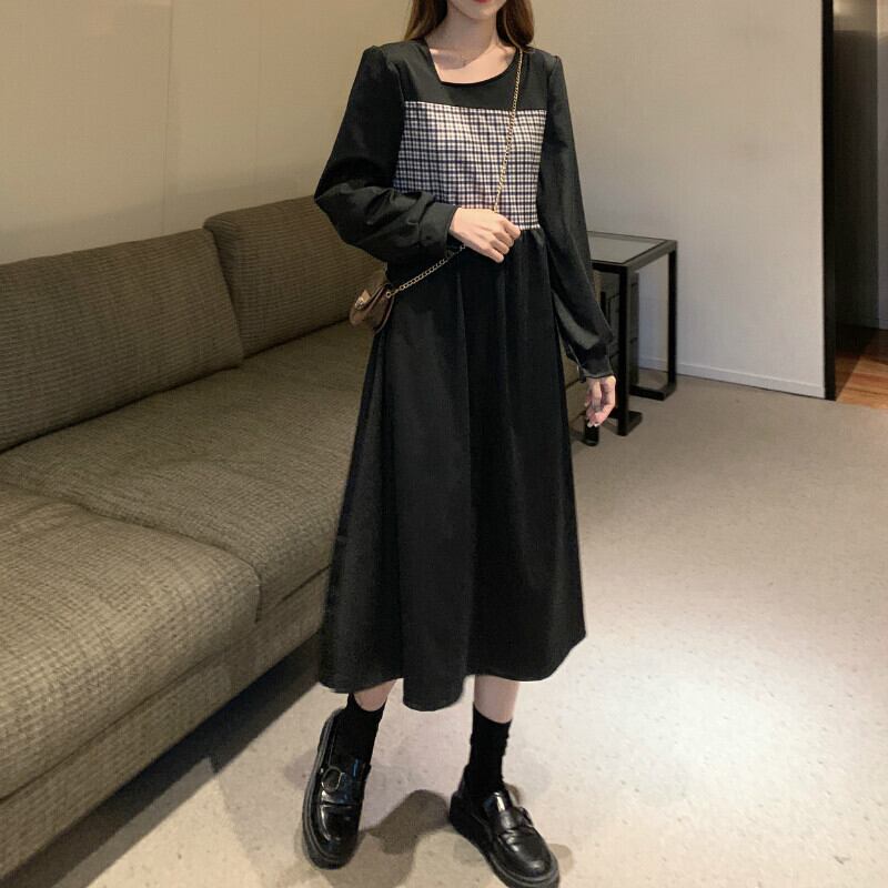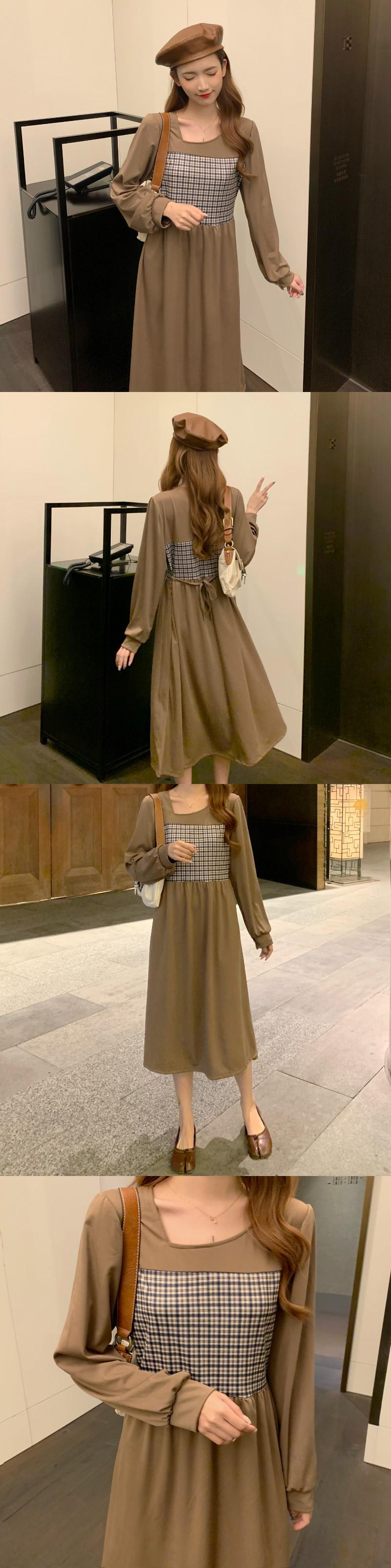 スタンダード格子柄長袖スリーブドレス ワンピース ロング レトロ ステッチ 普寧40871611678