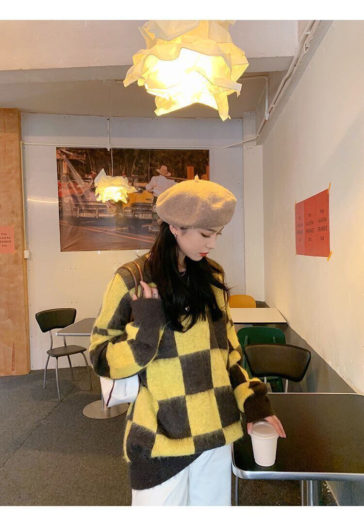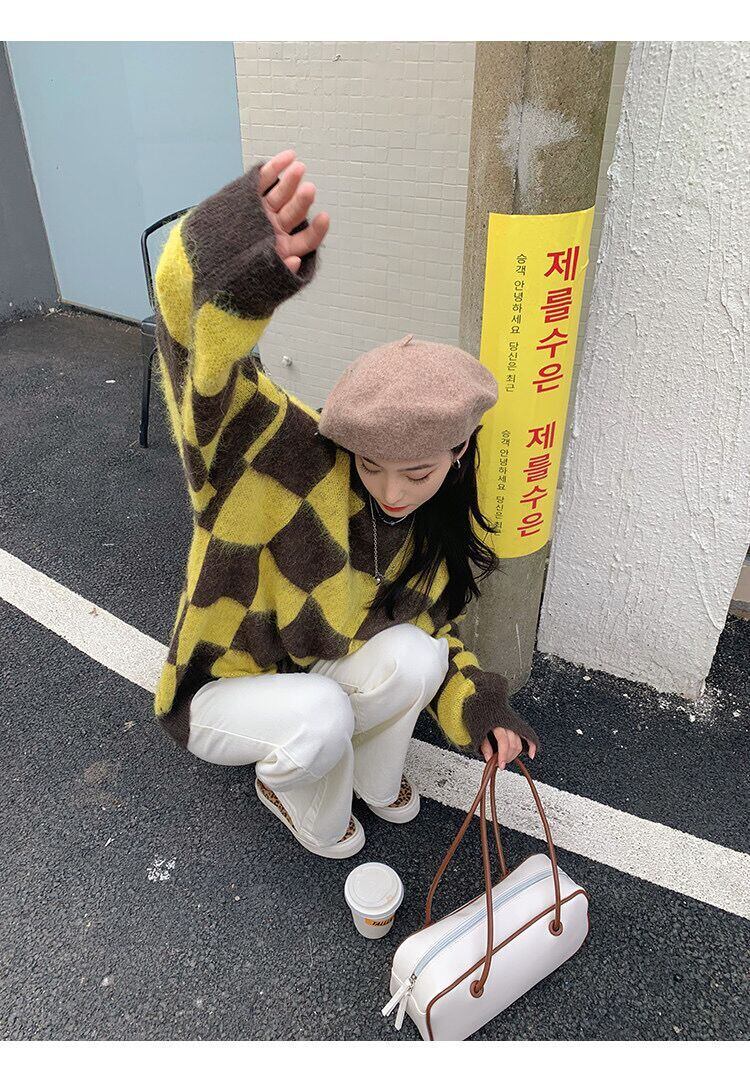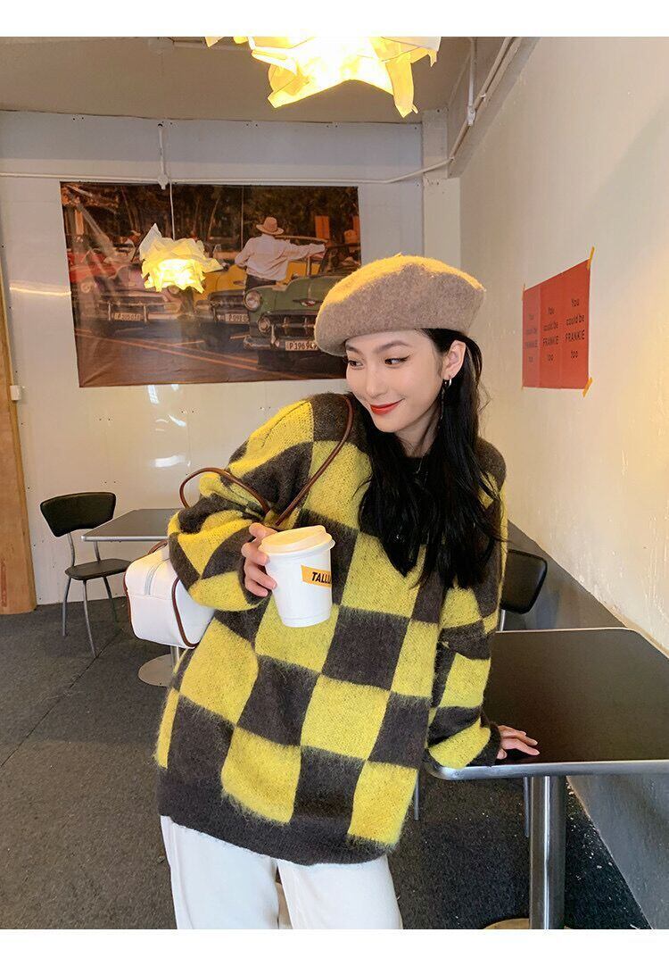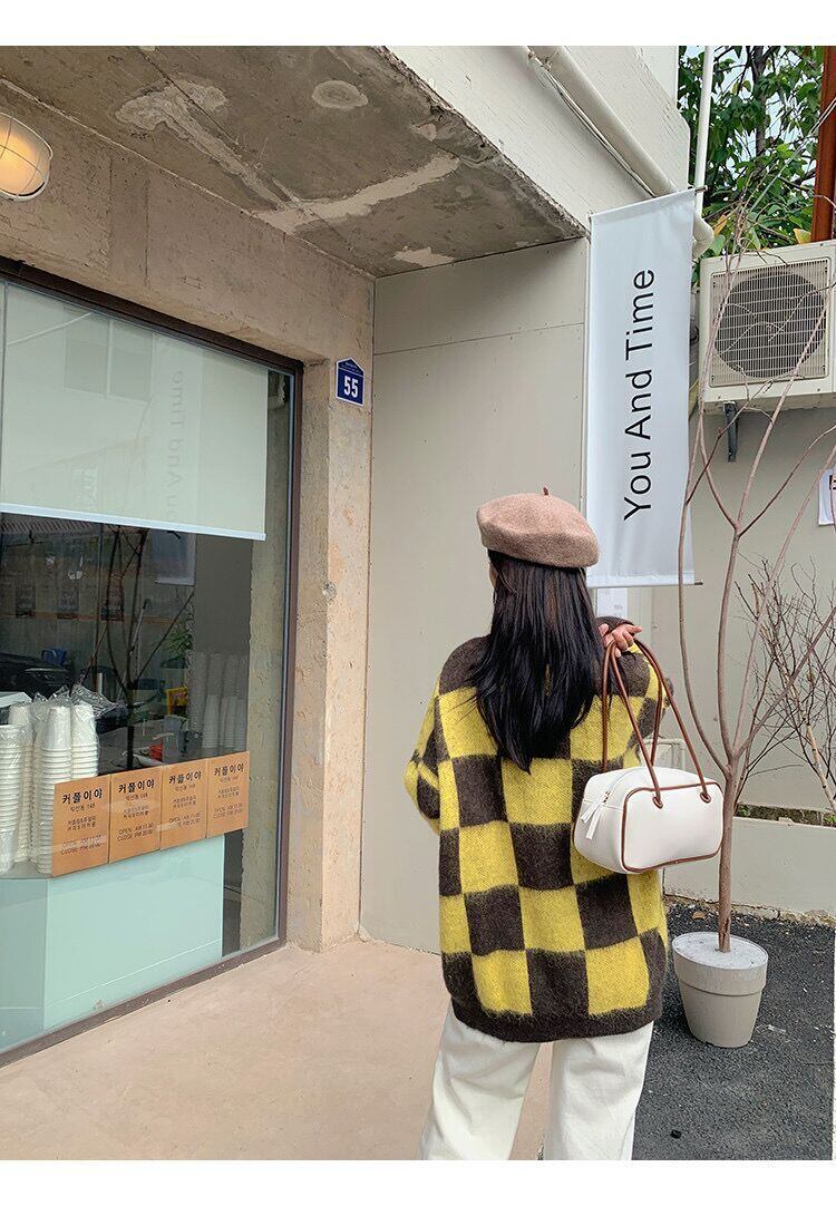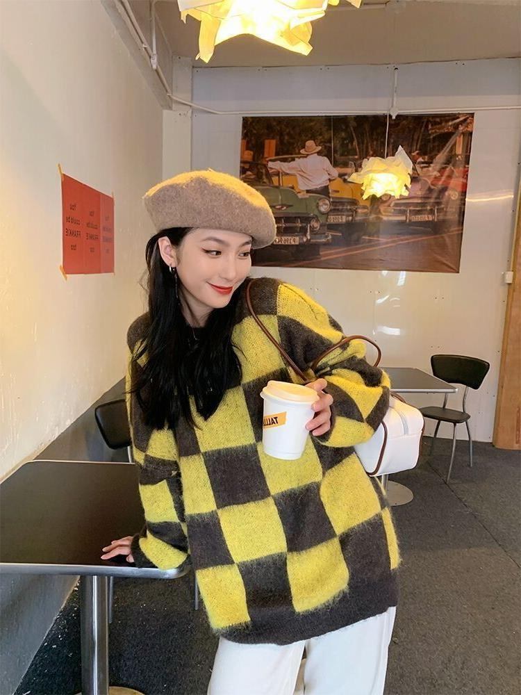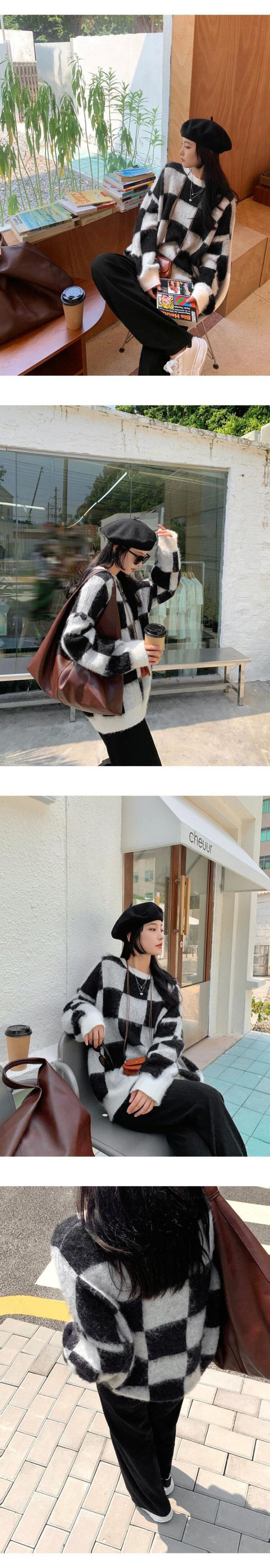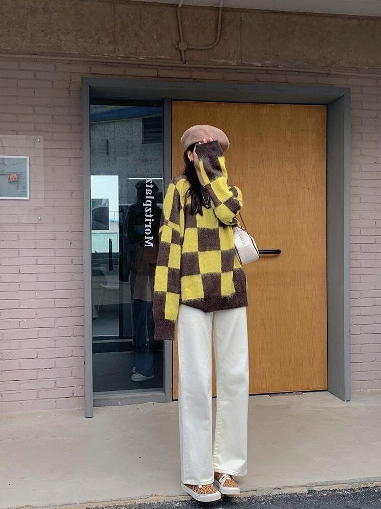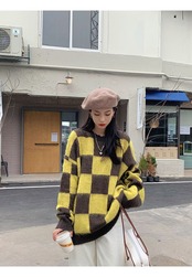 ブラックホワイト格子柄セーター オータムルーズスタイルニットジャケット 秋物 普寧77873537023