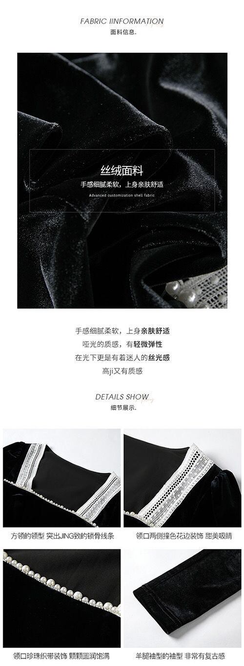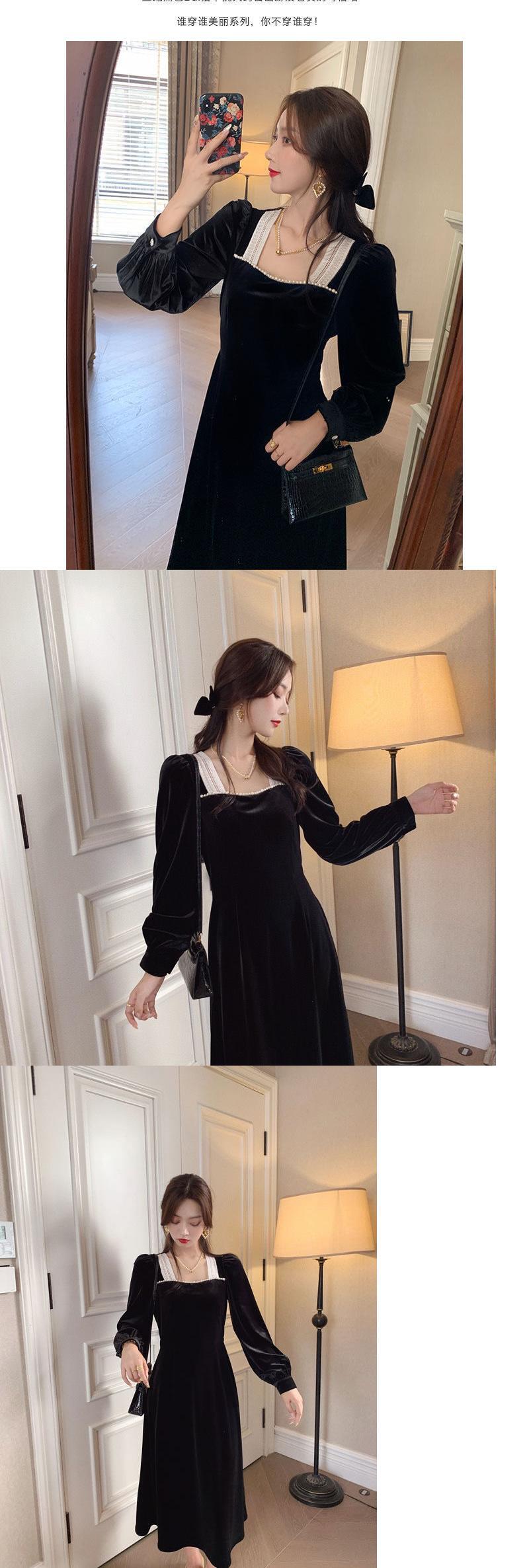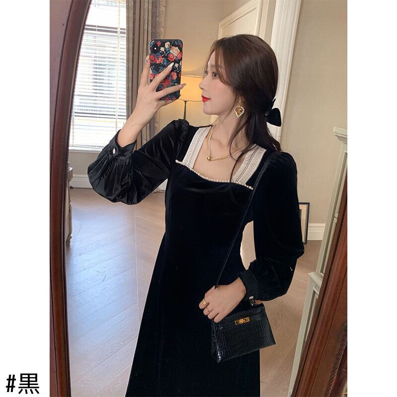 スタンダードカラースリーブゴールドベルベットオータムウィンタースタイルドレス レトロ レース 大きめサイズ 秋物 冬物 スクウェア 普寧66930519204