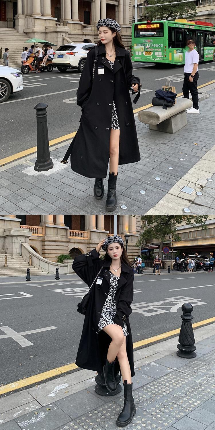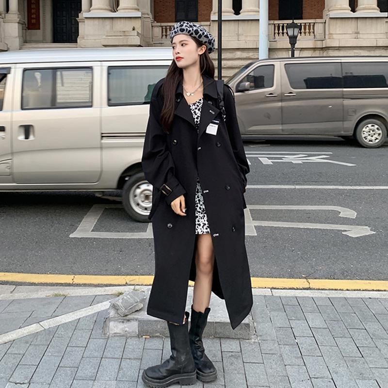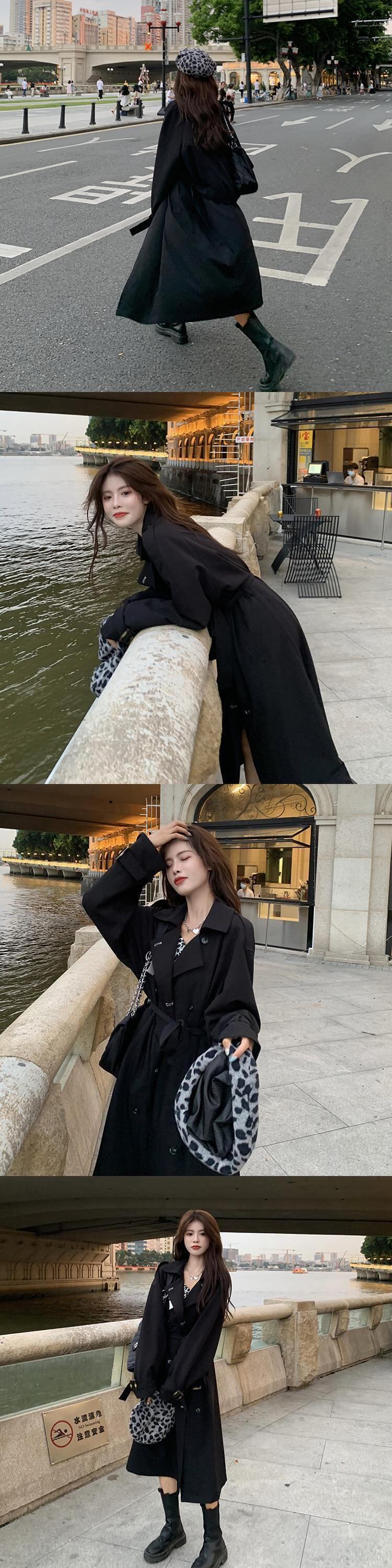 ダブルブレストブラックロングコート オータムスタイル薄手ジャケット レディース 秋物 普寧17558849410